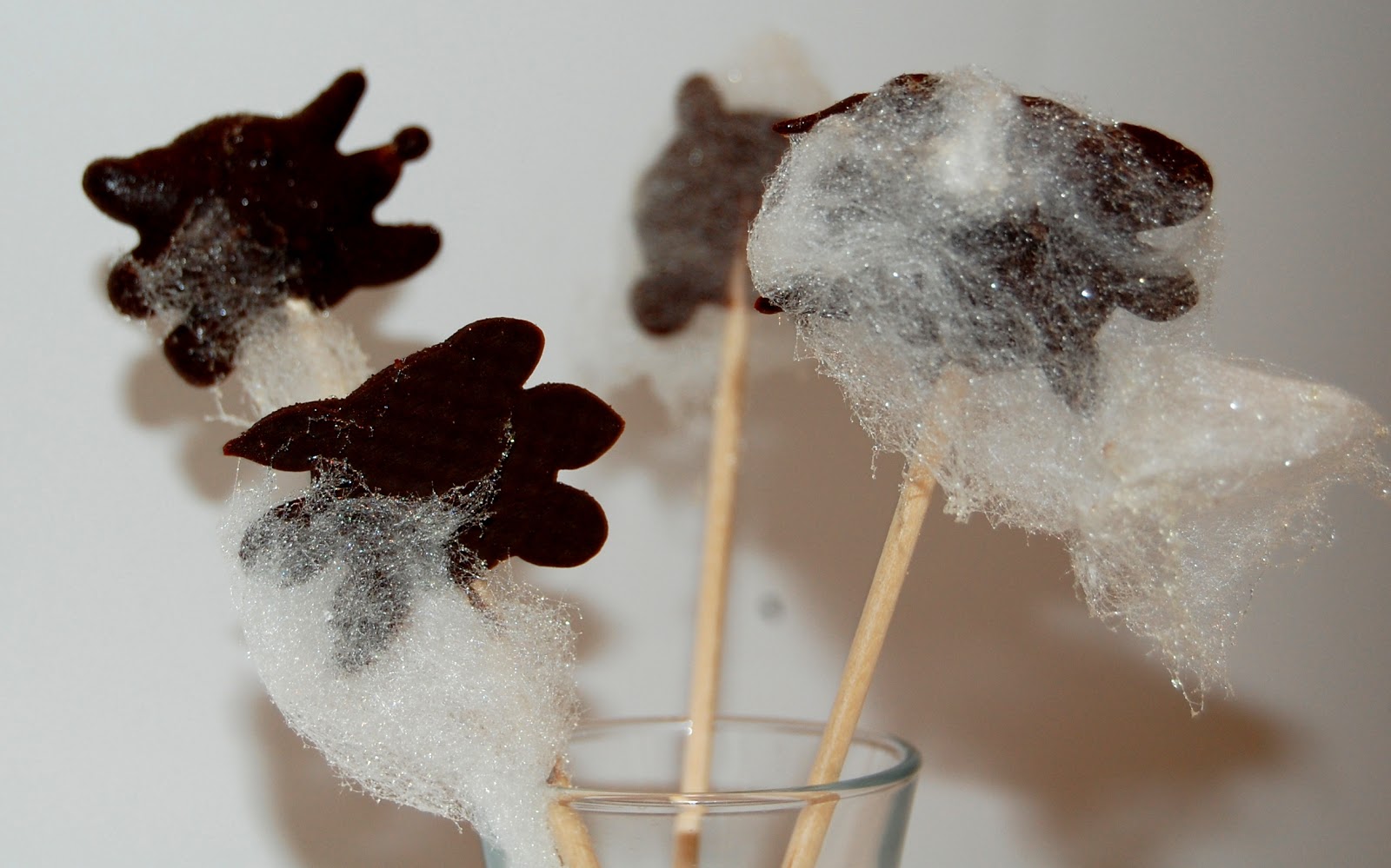Hacía tiempo que quería hacer algo con la máquina de algodón de azúcar que no fuese la simple nube, y se me ocurrió utilizarla para crear unas telarañas y cubrir con ellas unas arañas de chocolate.