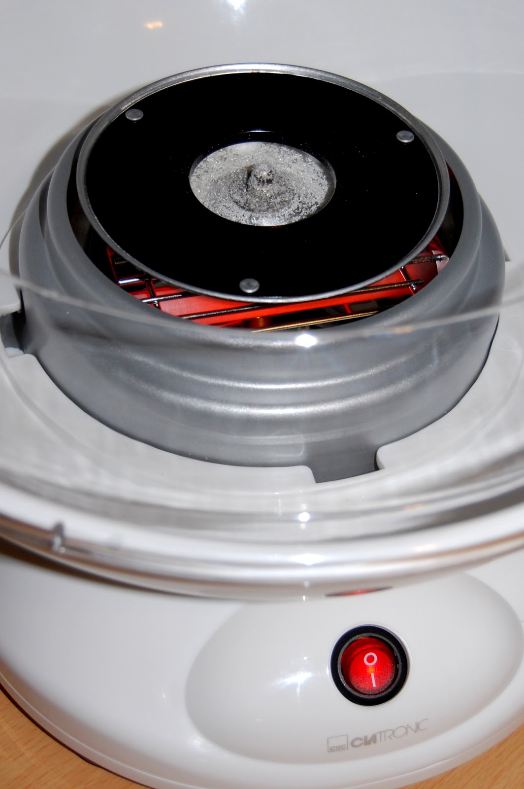 Preparad la máquina de algodón. Será necesario que la pongáis en funcionamiento, sin azúcar, durante 5 minutos para que se caliente lo suficiente.