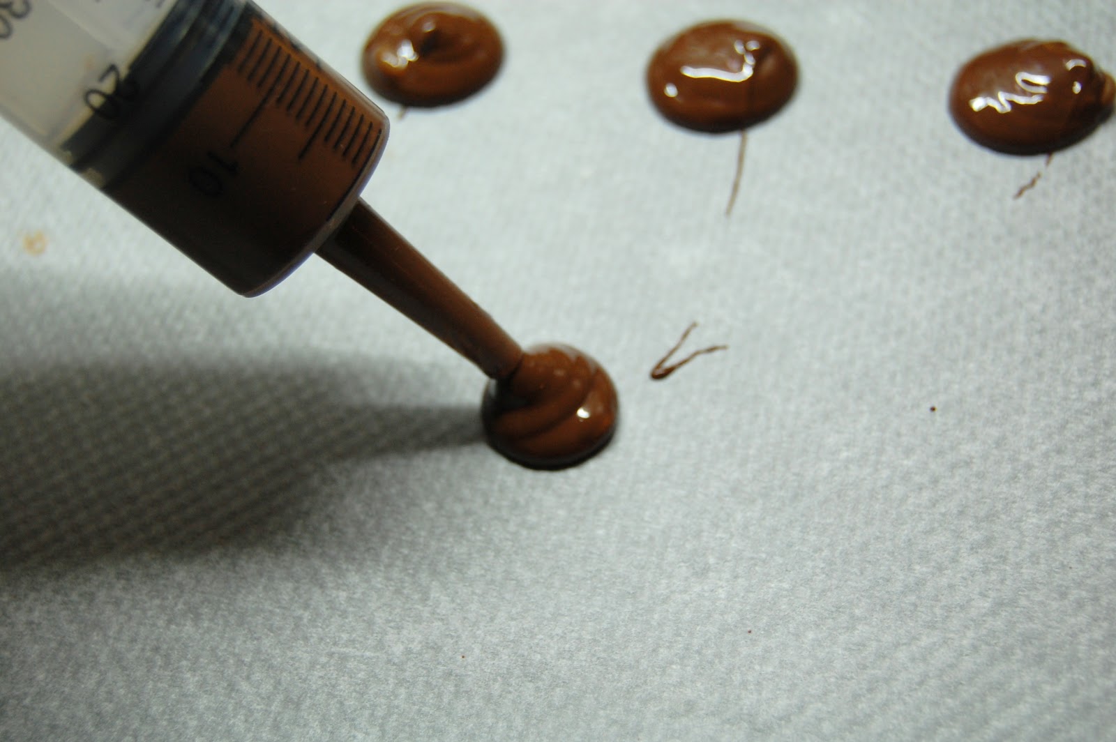 Derretid chocolate en el microondas y cargad con el una manga pastelera o una jeringa grande.Esperad que el chocolate enfríe 5 minutos para que no salga tan fluido. Sobre una lámina de papel vegetal, colocad unas gotas grandes que serán el cuerpo de las arañas.