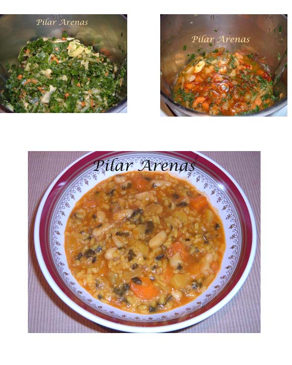 - Agrega el arroz por el bocal y programa, 13 minutos, 100º, giro a la izquierda, velocidad cuchara. Cuando falten 4 minutos para terminar, añade las alubias por el bocal. Vuelca en una fuente y sirve.