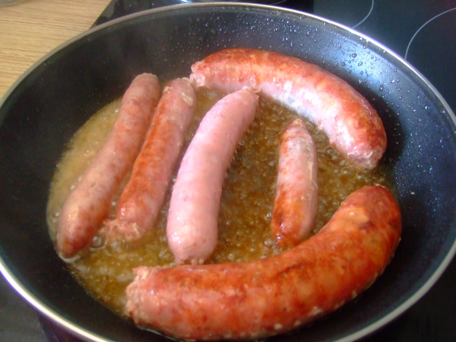 Mientras ponemos las salchichas y el chorizo criollo en una sartén con un poco de aceite y se deja que se frían..