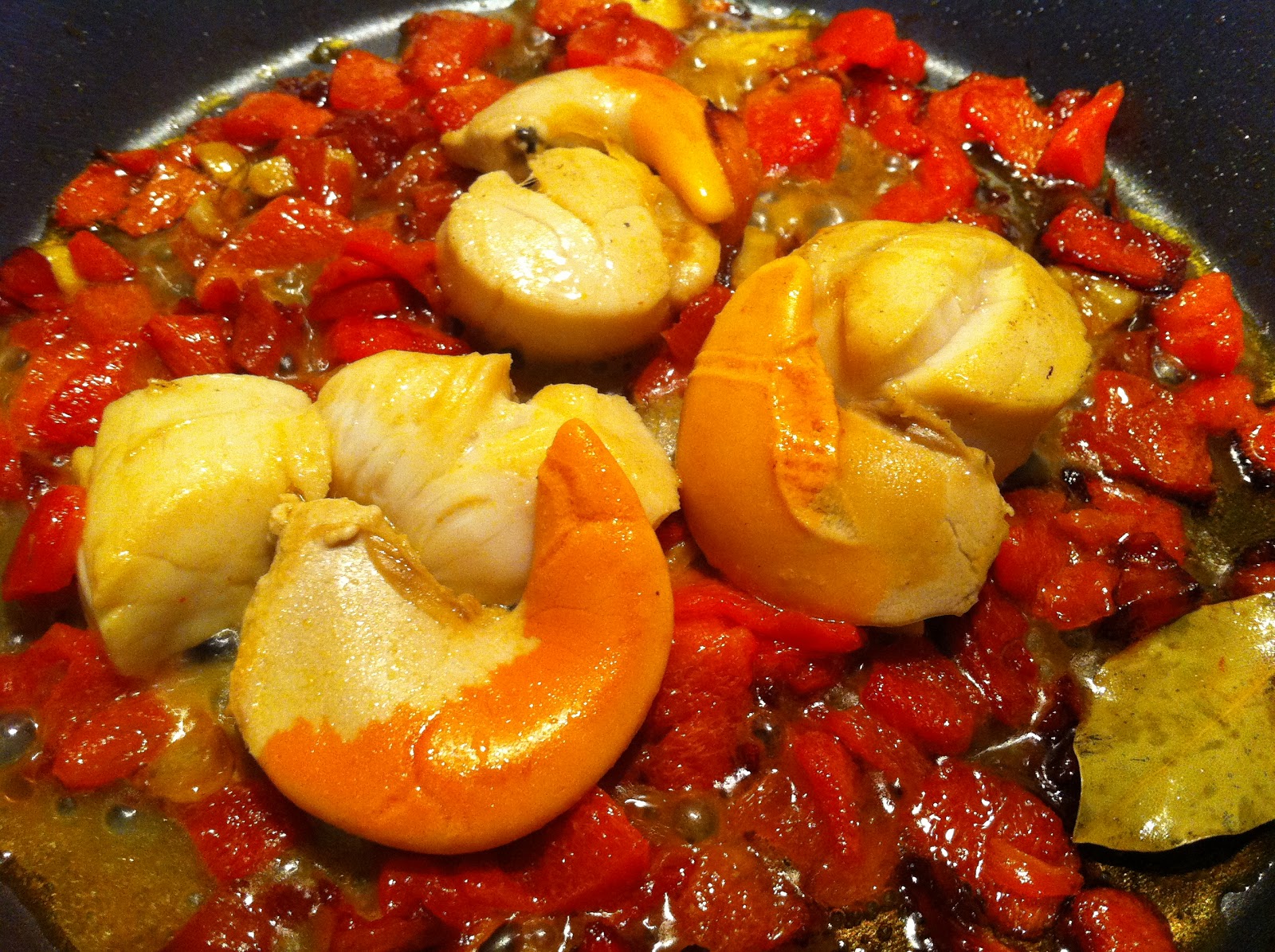 En una paella ponemos aceite de oliva con el laurel y sofreímos el pimiento y el ajo. Tras 10 minutos añadimos las vieiras limpias y doramos por ambos lados.