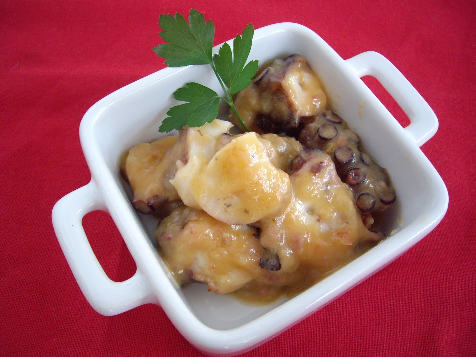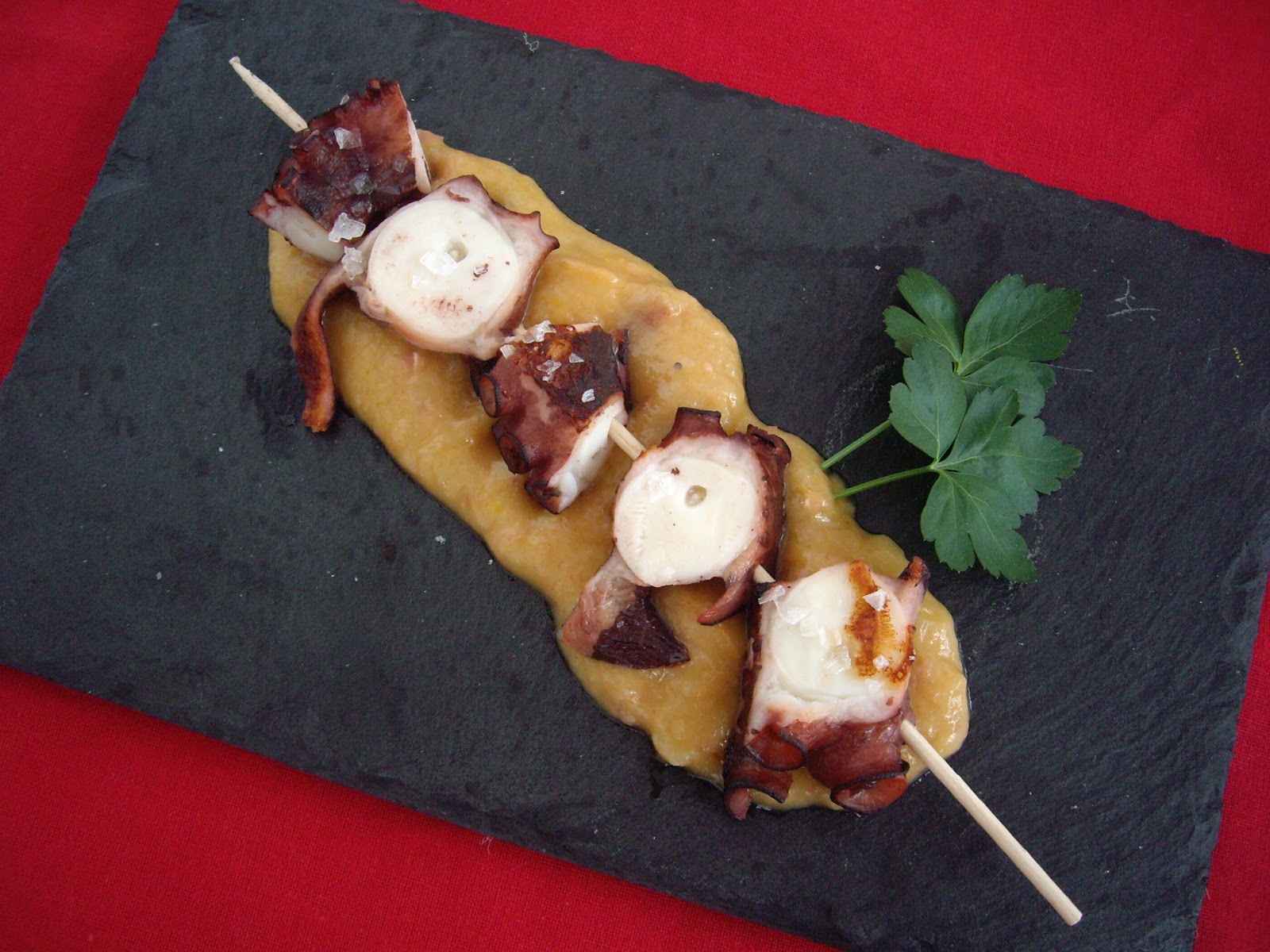 Otra receta ideal para aprovechar pulpo cocido. La presentaremos en función de si va a ser un aperitivo, un entrante o un plato principal. La salsa podemos triturarla o no, añadirle algo de tomate rallado, un poco de jamón serrano…