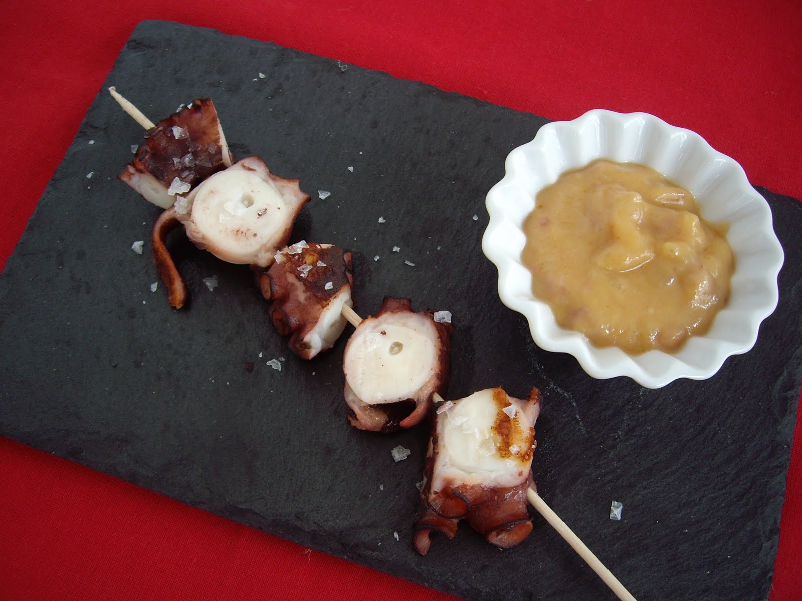 Presentamos las brochetas sobre el sofrito de cebolla, o con la salsa en un cuenco aparte y espolvoreamos unos cristalitos de sal maldon por encima, o todo mezclado en cazuelitas o cucharillas de aperitivo (para lo que no haría falta pasar el pulpo por la plancha). Listo!