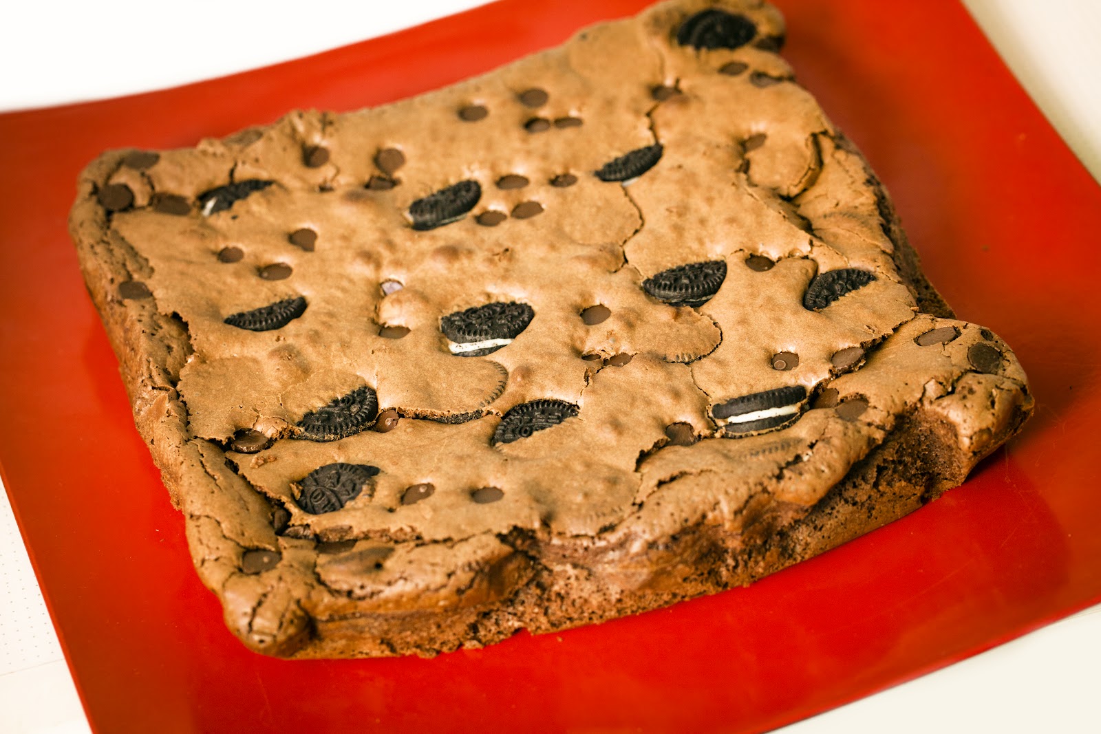 - Forre un molde de horno con papel de hornear y vierta la mitad de la mezcla. Ponga encima uno de los dos paquetetitos de galletas oreo mini, y cubra con la otra mitad de la mezcla. Disponga el otro paquetetito por encima y las gotas de chocolate.