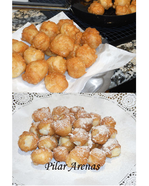 - Fríe en abundante aceite caliente cucharaditas de masa, hasta que estén dorados. Rellena con crema pastelera, nata montada u otro relleno a tu gusto.