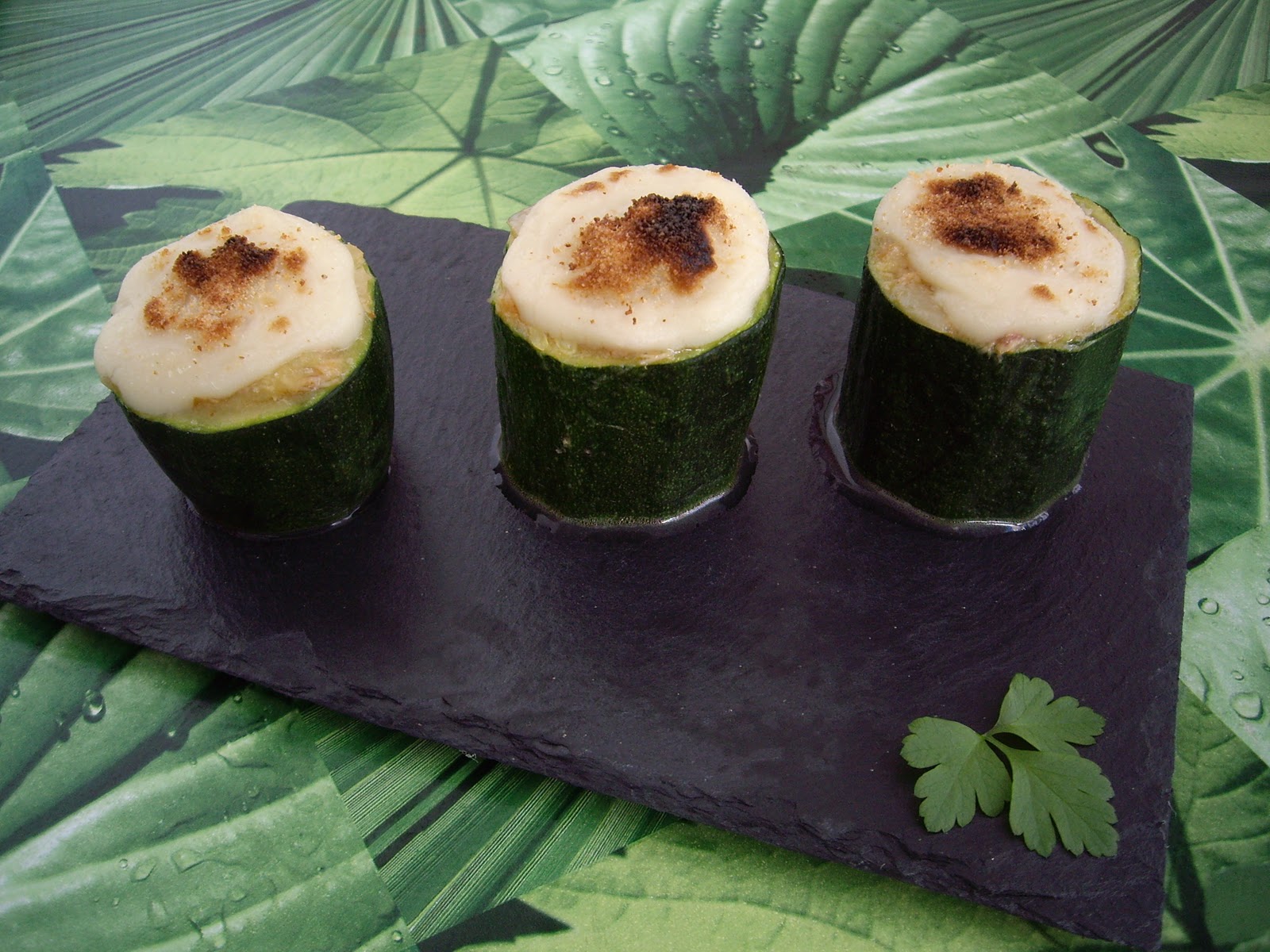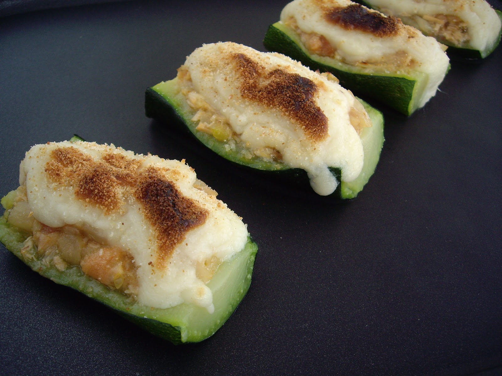 Preparamos una fuente apta para el horno y disponemos las barquitas o los cilindros de calabacín y rellenamos con el sofrito con atún.