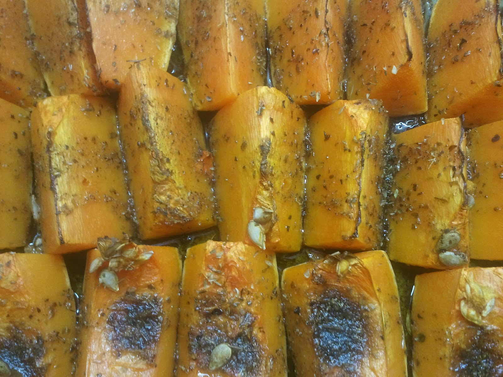 Poned los trozos de calabaza en la bandeja del horno y verted la mezcla. Asad a unos 200 grados ente media hora y cuarenta minutos (hasta que pichéis la calabaza y la notéis tierna).