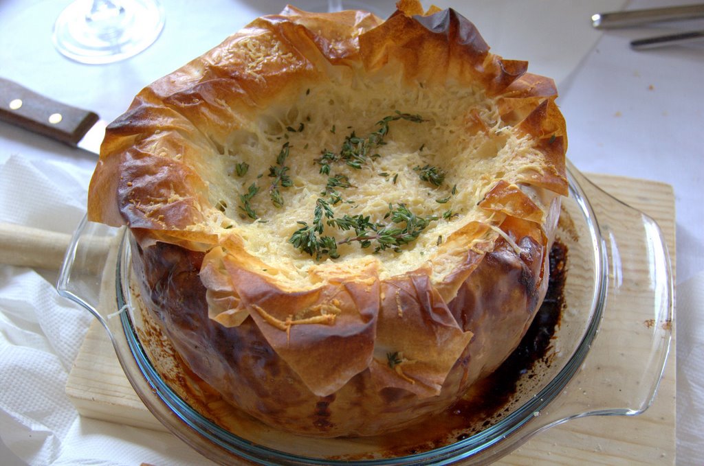 Para servir, la tenéis que cortar como una tarta: en porciones. Las capas de pasta filo entre la piel y el relleno le aporta un toque crujiente muy curioso.