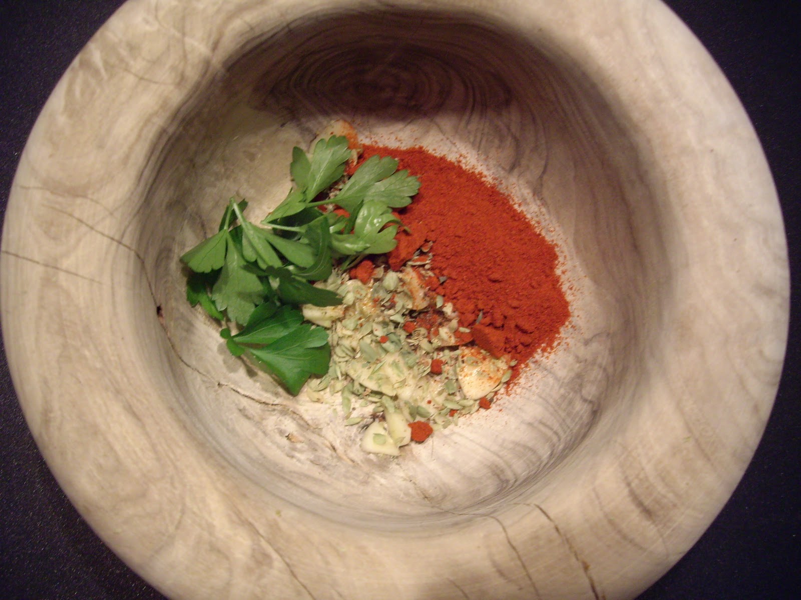 En un mortero machacamos los dientes de ajo, el perejil, el orégano, el piméntón y la pimienta con la sal.