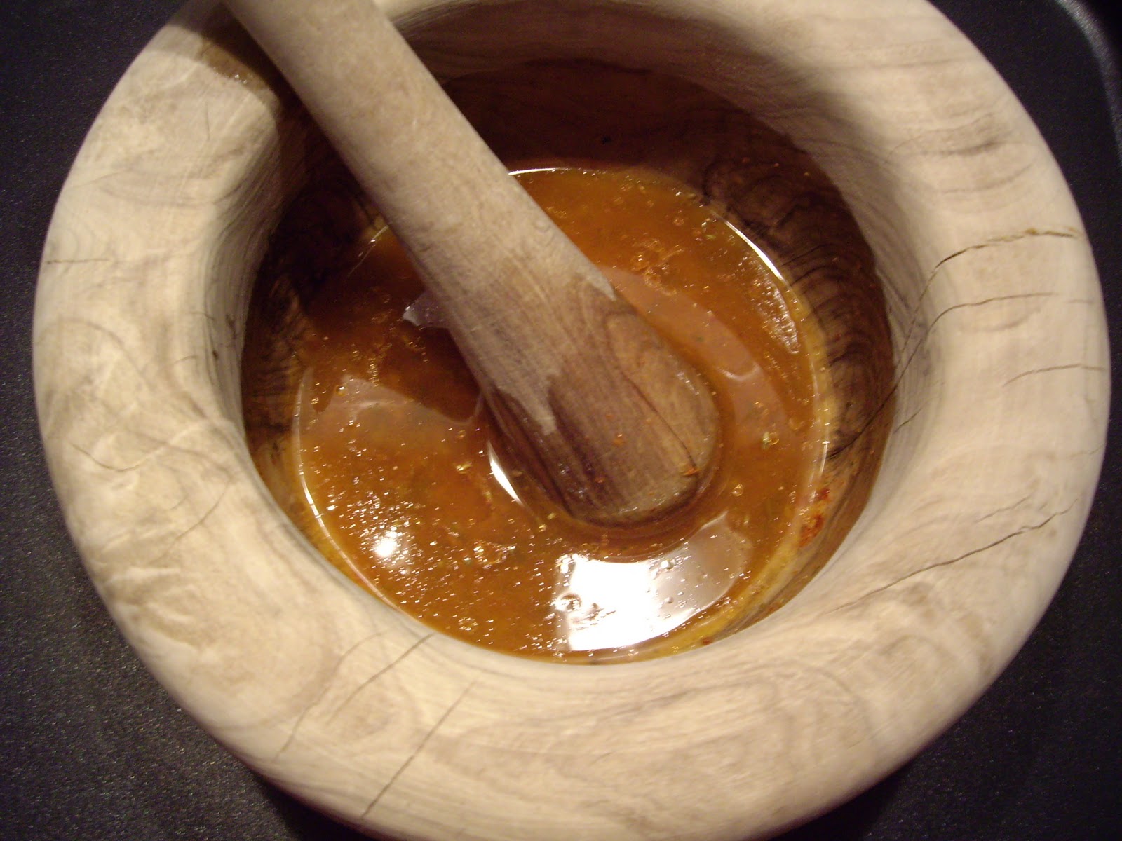 Añadimos ahora los líquidos al mortero: el aceite y el vinagre. Mezclamos bien.