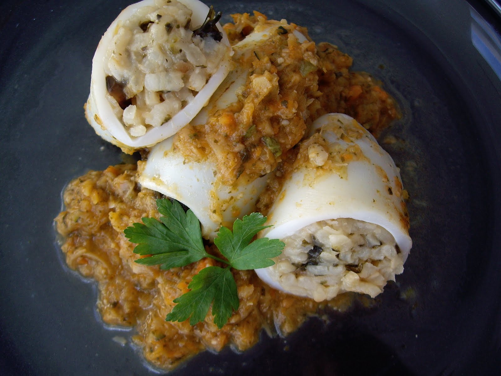 Esta receta nace de la improvisación. Me apetecía rellenar los calamares de algo diferente. La salsa la he hecho con las verduras que tenía en la nevera. Yo pongo la idea, vosotros decidís.