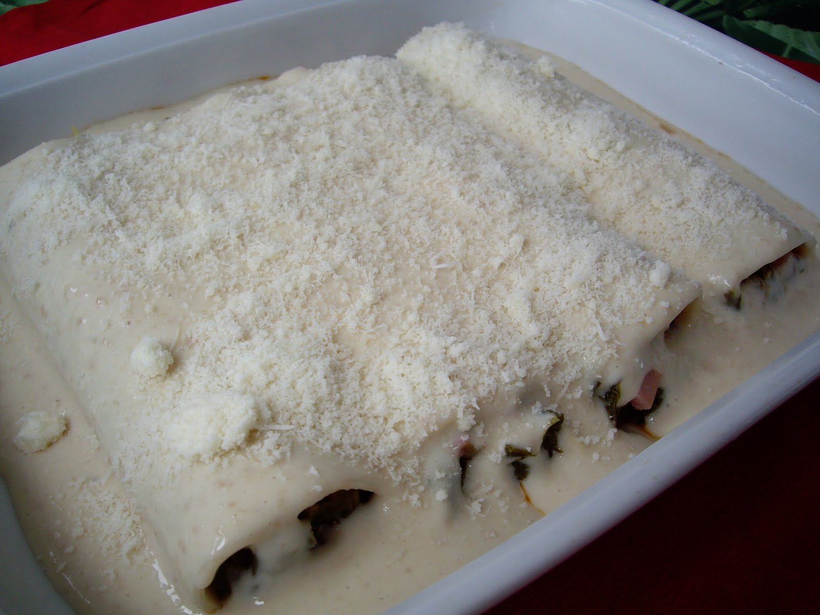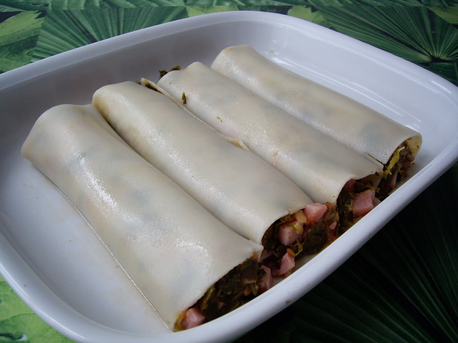 Estos canelones se pueden rellenar con pescado, paté, jamón y queso… Yo he utilizado grelos y jamón cocido, pero admite de todo.