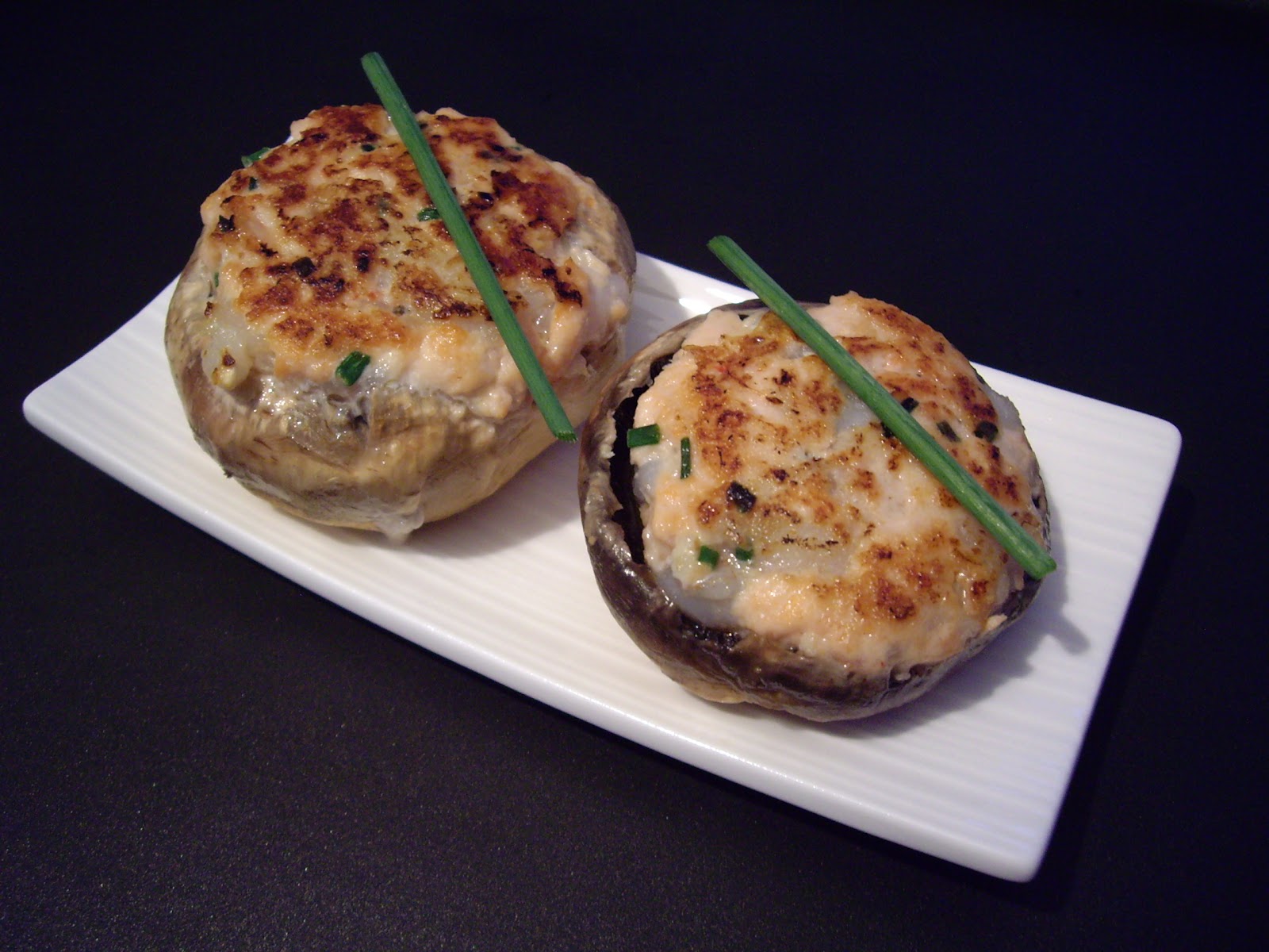 Rellenamos los sombreritos de los champiñones y rellenamos con el picadillo de salmón, gambas, ajo y cebollino.