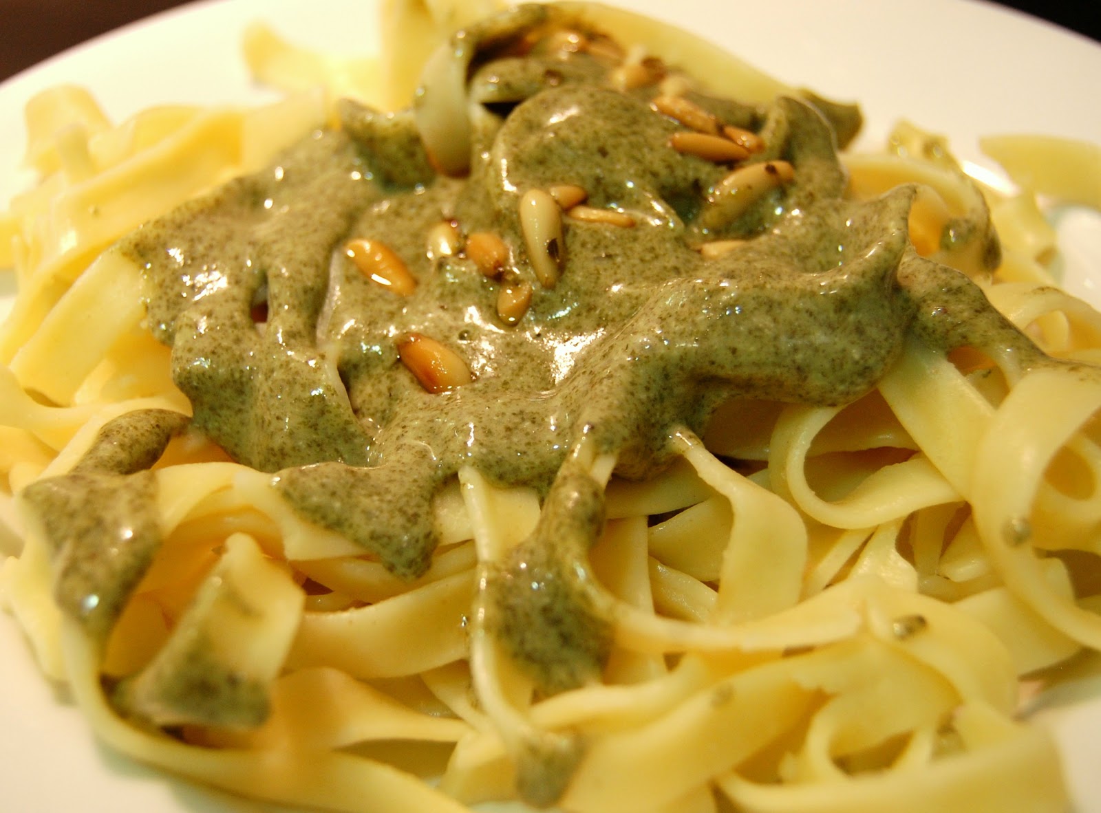 Servid la pasta en plato hondo con un poco de salsa pesto y los piñones tostados.