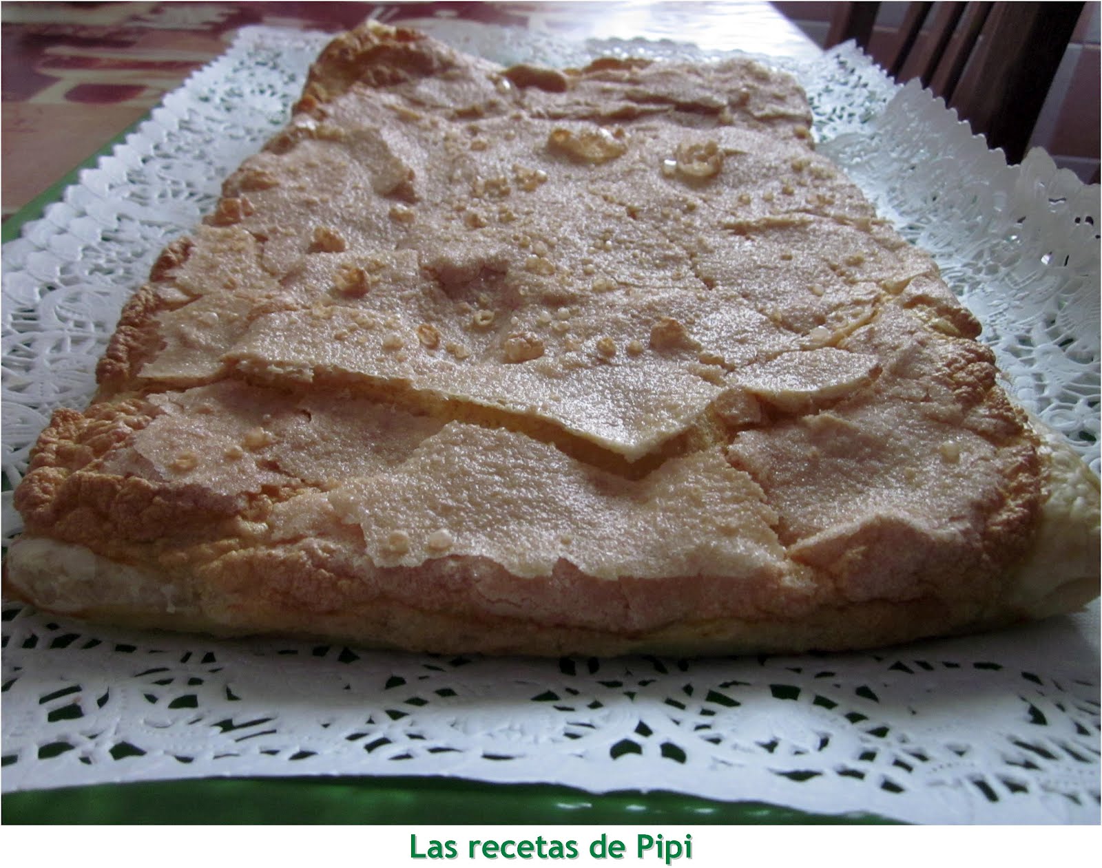 Mientras extender con las manos una de las láminas de hojaldre haciéndola un poco más grande, levantar los bordes un poco y pinchar el fondo con un tenedor y cuando veamos que la crema ya no humea pero sigue caliente la echamos por encima de la lámina de hojaldre.