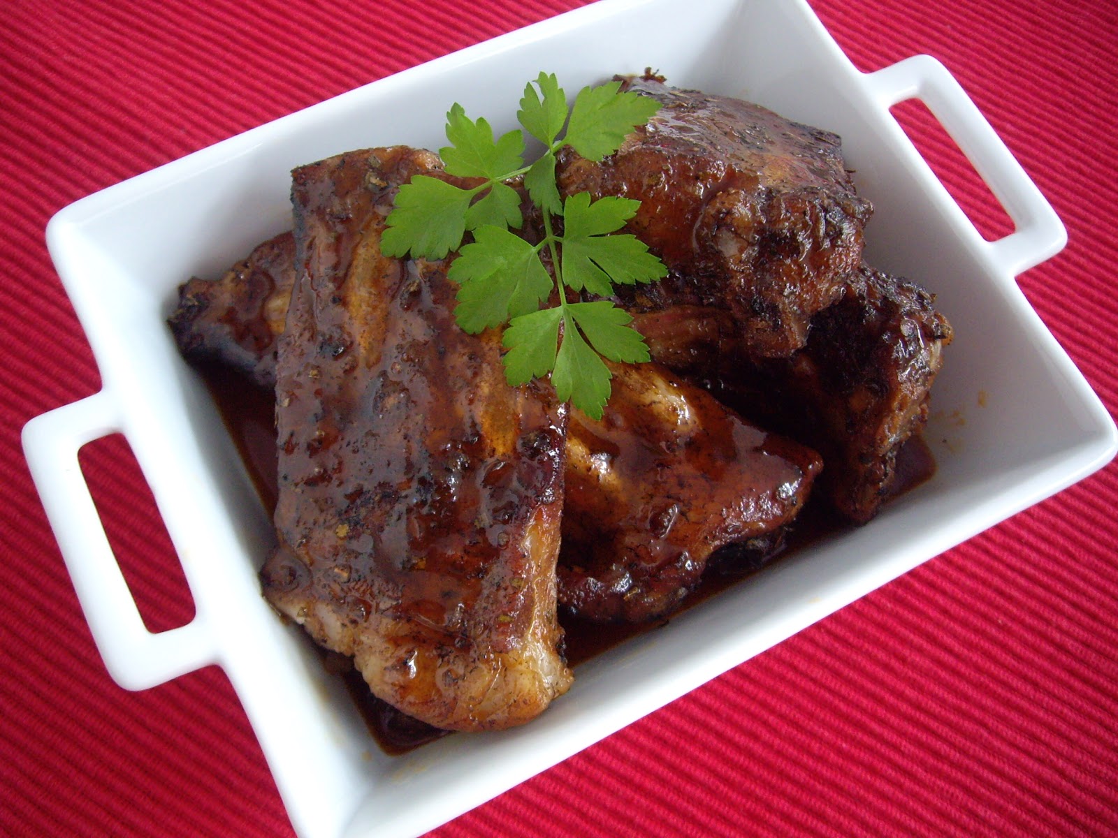 Mientras, ponemos en una fuente apta para el horno la costilla entera o en trozos (podemos pedir al carnicero que corte cada tira en dos).