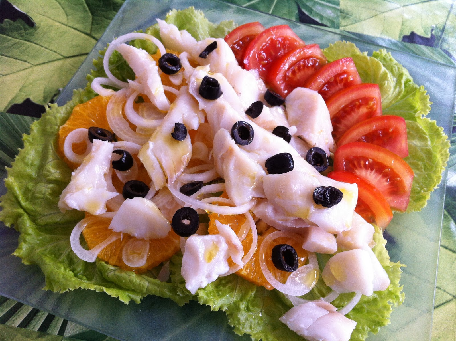 Esta receta típica malagueña y de origen árabe tiene (como casi todo) infinitas versiones: con el bacalao desalado y crudo, sin tomate ni lechuga, con pimientos, con aceitunas verdes, con huevo duro, con una base de patata…