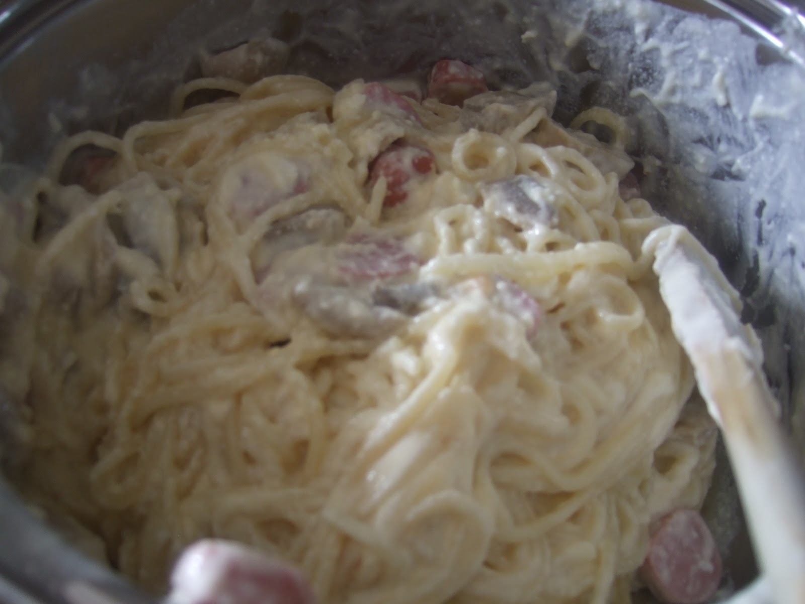 Se echan dos huevos, se remueve un poco y se le añaden los espaguetis y se dejan que se cuajen los huevos.