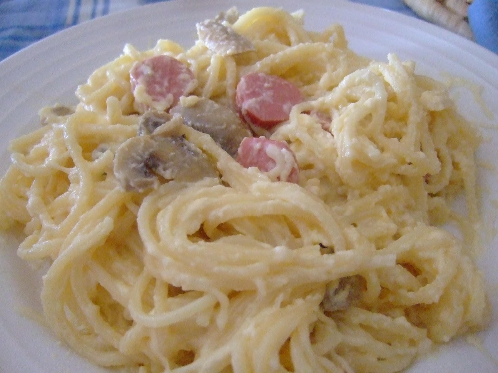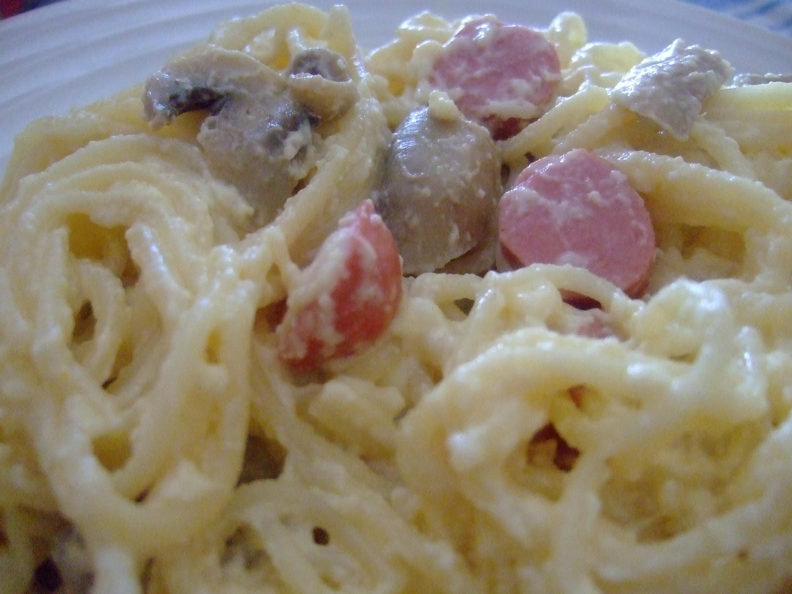 Mientras en un la misma cazuela de cocer los espaguetis se pone aceite y una vez caliente, echar los champiñones y las salchichas.
