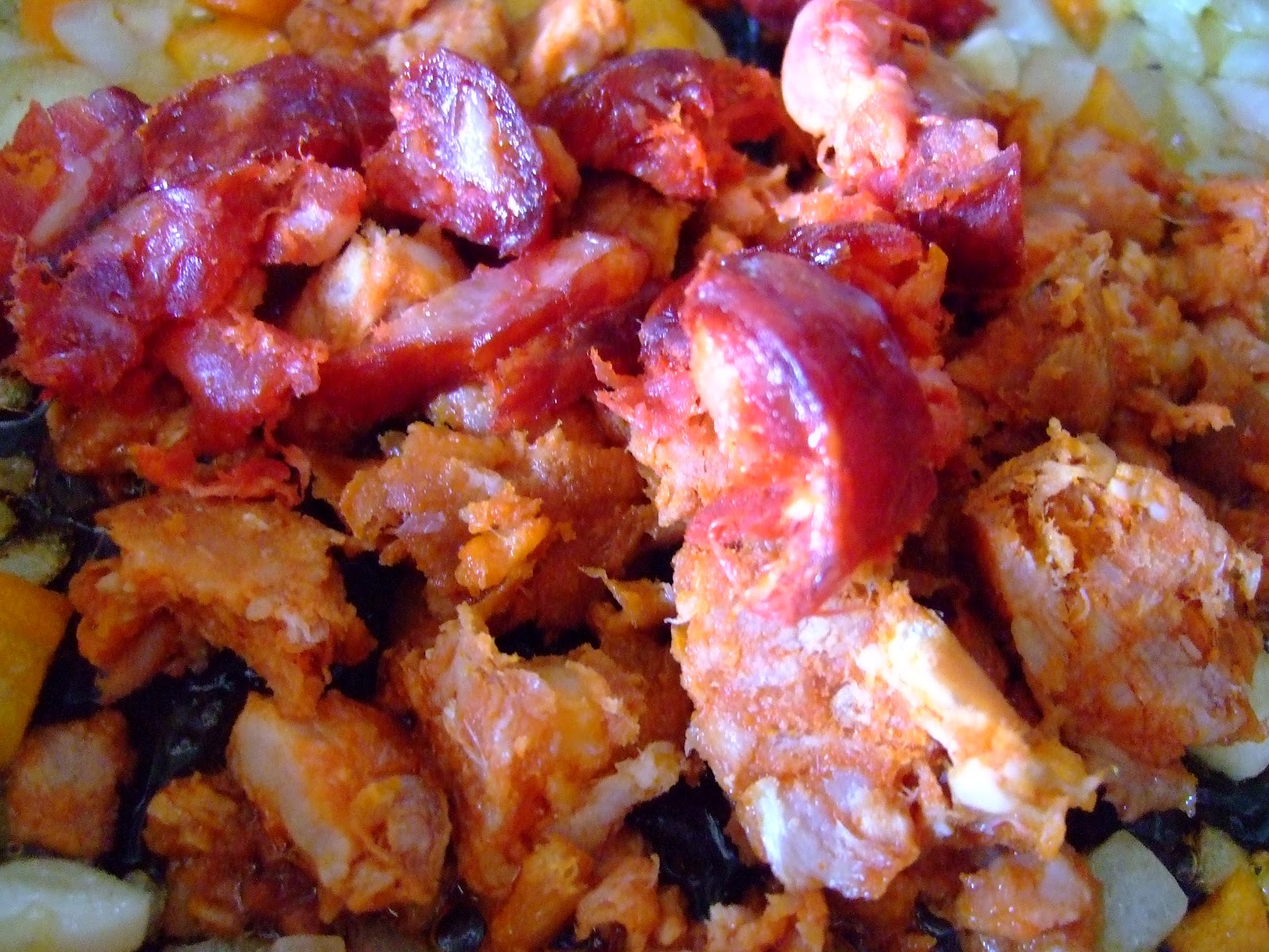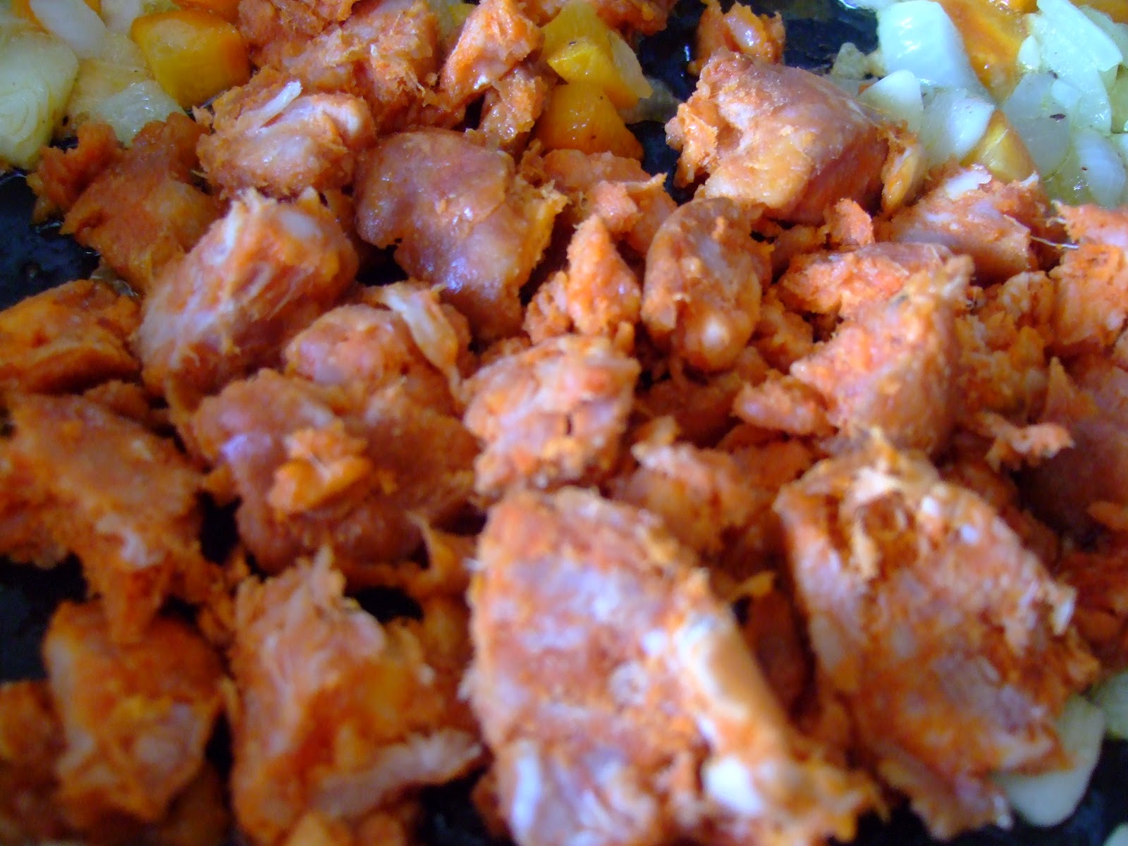 Cunado las verduras estén pochadas, hacemos un hueco en el medio y añadimos el chorizo y removemos.