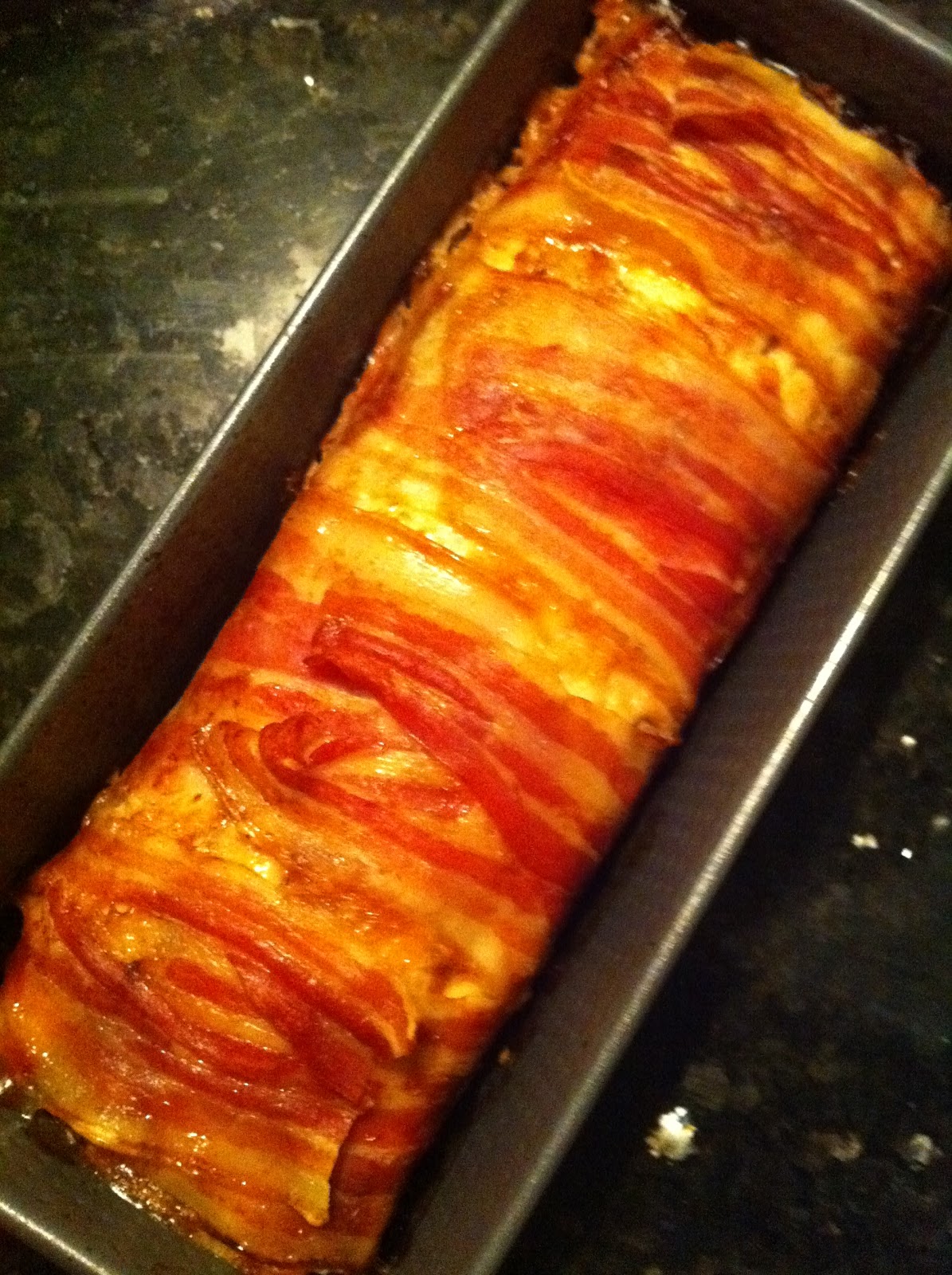 Ahora introducimos nuestro pastel en el horno precalentado a 180º. Horneamos durante 40 minutos y comprobamos que esté cocinado en el centro.La tocineta se tostará, y hará de envoltorio. Por loncha poco se notará, pero aportará gusto y un poco de grasilla, pero sin ella también está muy rico.