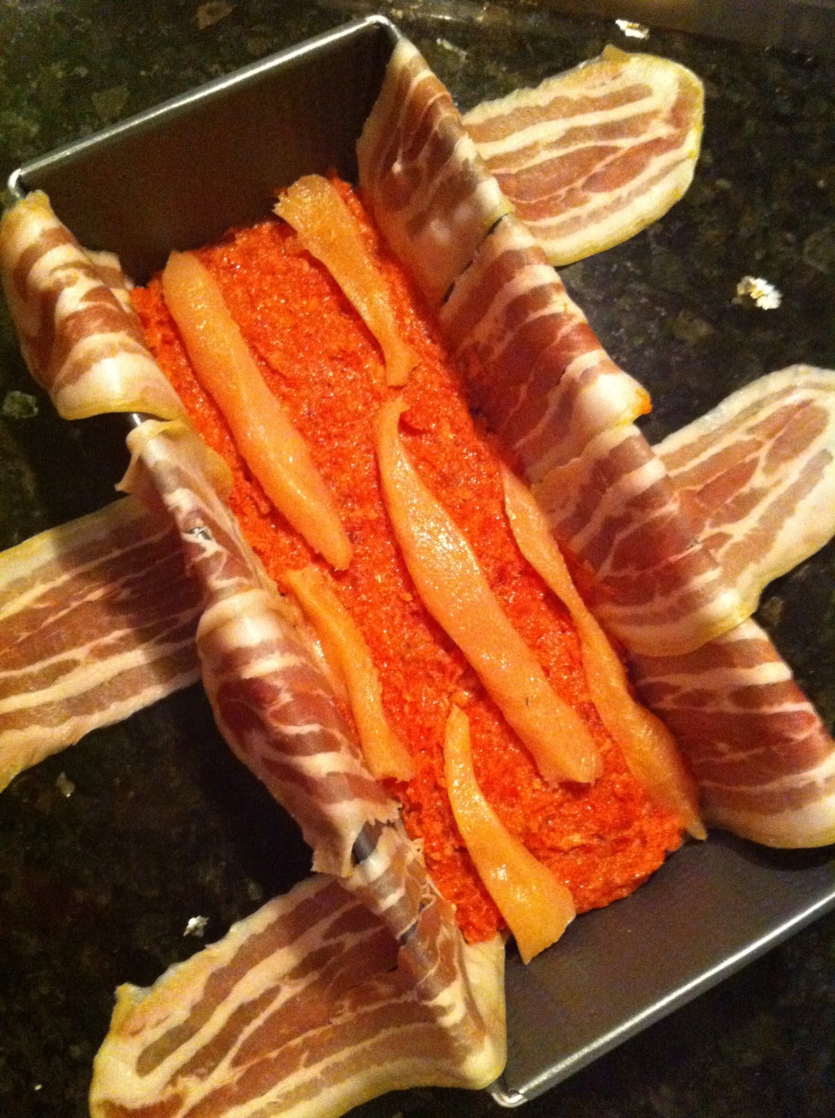 Sólo queda «cerrar» con las tirar de tocineta que nos sobran por los lados. Primero las más cortas, y por último las más largas.