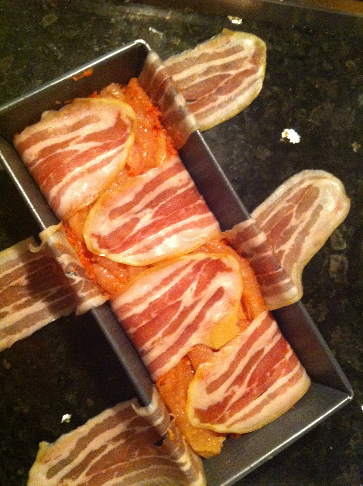 En esta receta utilizo bacon para envolver el pastel, pero si prescindimos de él tendremos un plato totalmente De Dieta, magro, y sabroso. Simplemente engrasaríamos el molde de plum-cake con un poco de aceite de oliva para desmoldarlo con facilidad.Podemos formar el pastel con capas: una con la masa hecha sólo con carne de ternera, otra sólo con la carne de pollo picada, otra mezclando la «masa» con jamón serrano o jamón cocido… imaginación al poder!Tenemos que tener cuidado con el punto de sal. Hay que tener en cuenta que la tocineta y el jamón serrano ya aportan sal, y que la pechuga de pollo la vamos a poner sin adobar, aunque también podemos tenerla en la nevera, hecha tiras y con un poco de condimento para que absorba sabores.