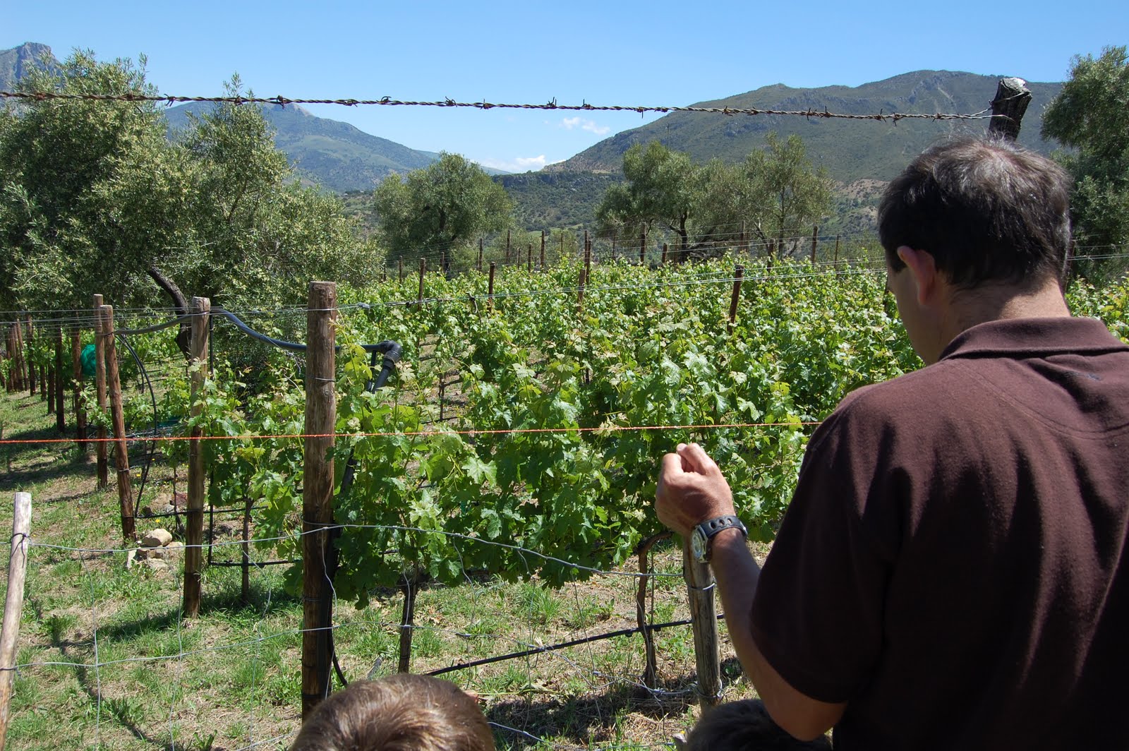 En ese momento me acordé de una visita que hicimos a una pequeña viña, propiedad de Luis Lucero (que también se dedica al negocio del aceite -Oleum Viride-). La viña, pequeña, se encuentra en Las Covatillas, cerca de Zahara de la Sierra (en Cádiz). Allí Luis se ha construido un refugio en la ladera del monte y ha aprovechado una de las cuevas naturales de la zona para montar su bodega, pequeña también, donde ha puesto un par de barricas y poca cosa más.