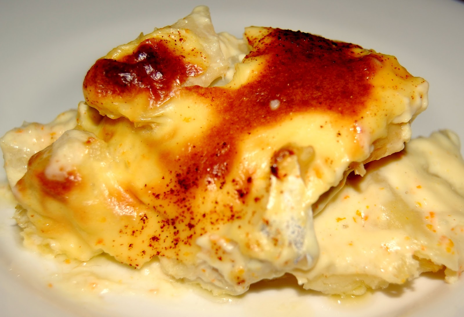 Sacamos la fuente y añadimos una capa de bechamel, el bacalao partido en trozos, la cebolla pochada y otra capa de bechamel encima. Volvemos a meter en el horno y lo tenemos 10 minutos más, esta vez con en grill para que la capa superior se gratine y adquiera un bonito color.