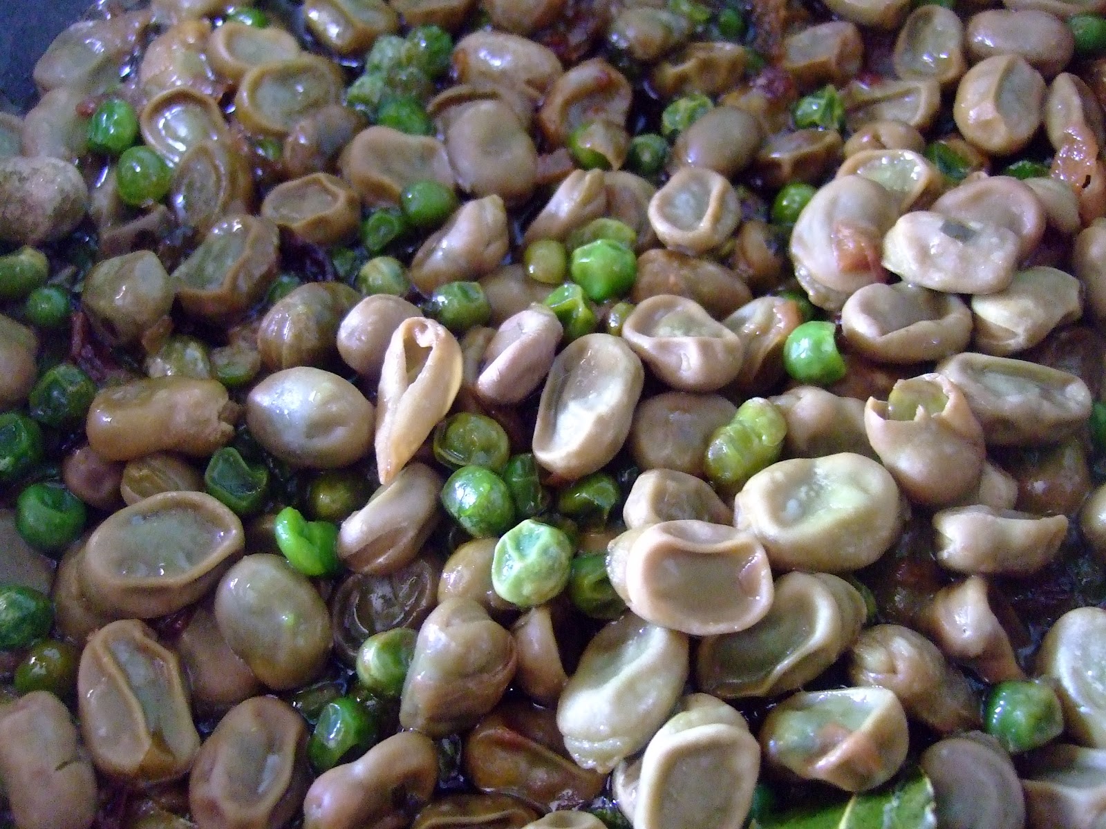 Añadir las Habas, los guisantes el vaso de jerez poner sal al gusto y dejar cocer durante 15 minutos tapando la sartén con una tapadera.