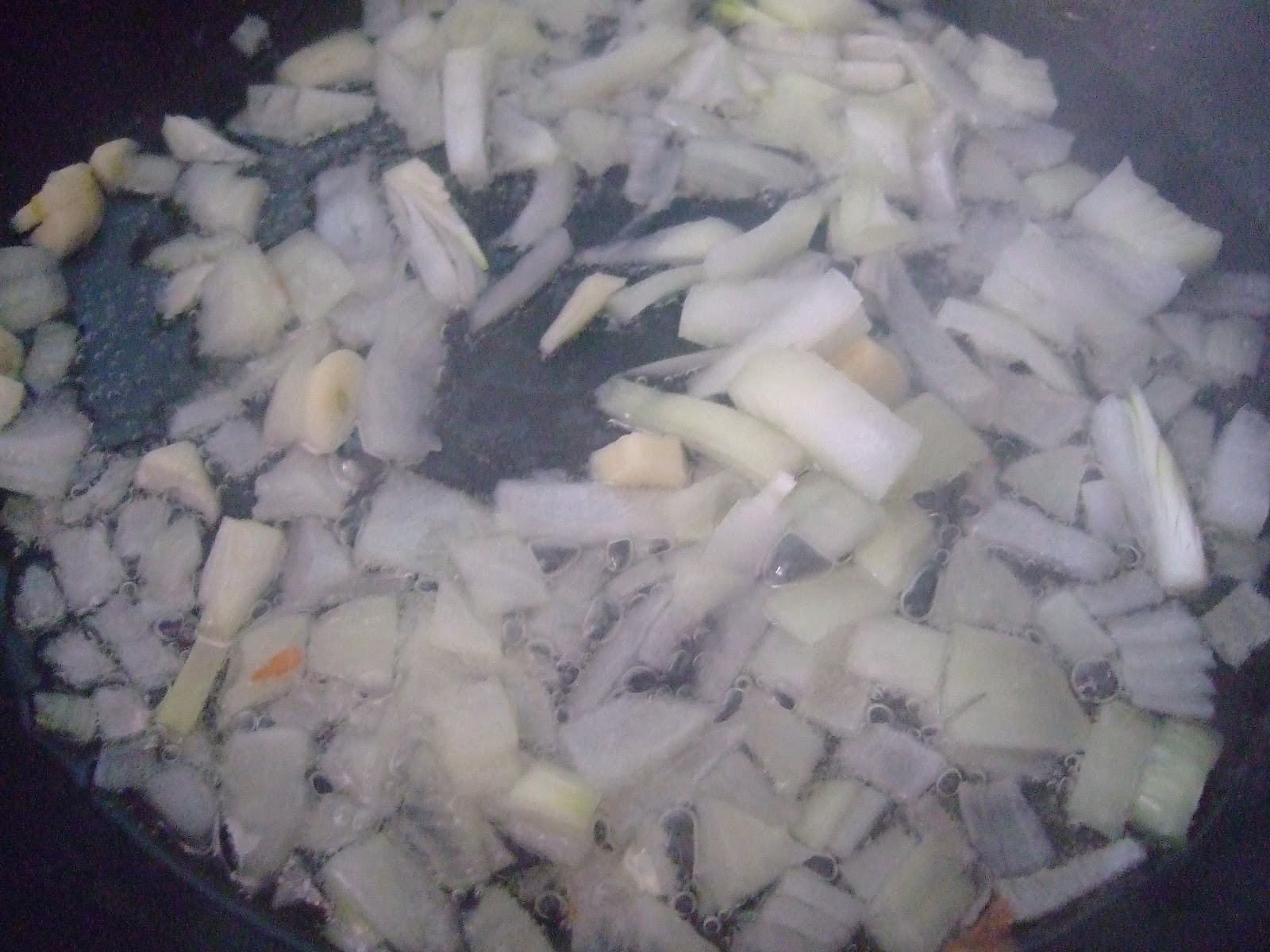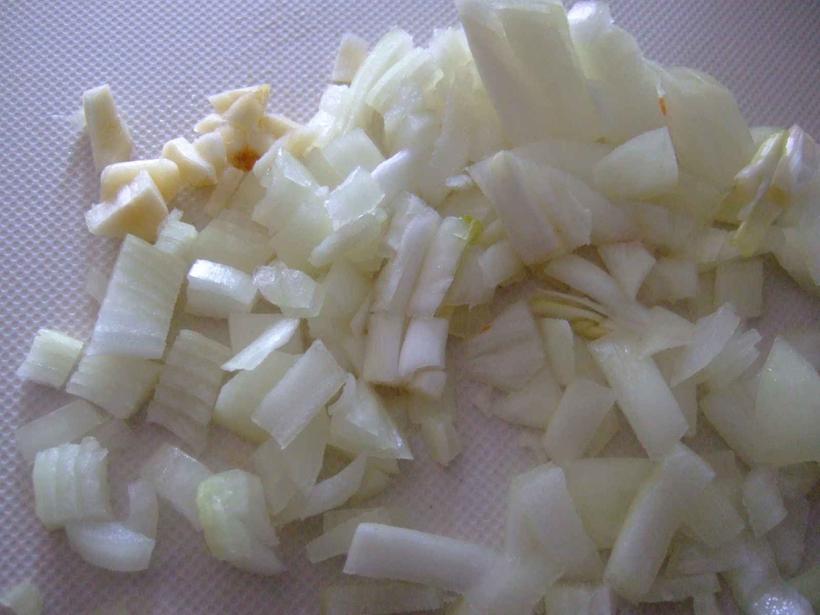 Mientras trocear la cebolla en trozos pequeños, junto con los ajos.