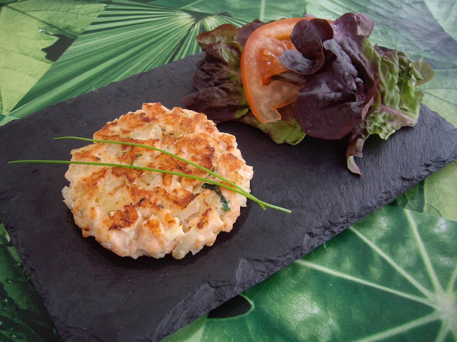 Calentamos una sartén o plancha sin nada de aceite (el salmón contiene bastante grasa y no le hará falta) y pasamos la hamburguesa por ambos lados.
