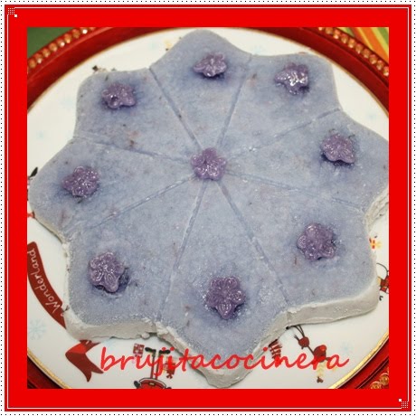 dos hojas de gelatinas desidratada en agua fria escurrirlas y poner en el vaso con una cucharada de mermelada de lilas y un poco de azúcar glas de carmelo lilas. programar 3 minutos a 100 º velocidad 1 y hechar en el molde colocando para adornar un carmelo de lila en la gelatina.