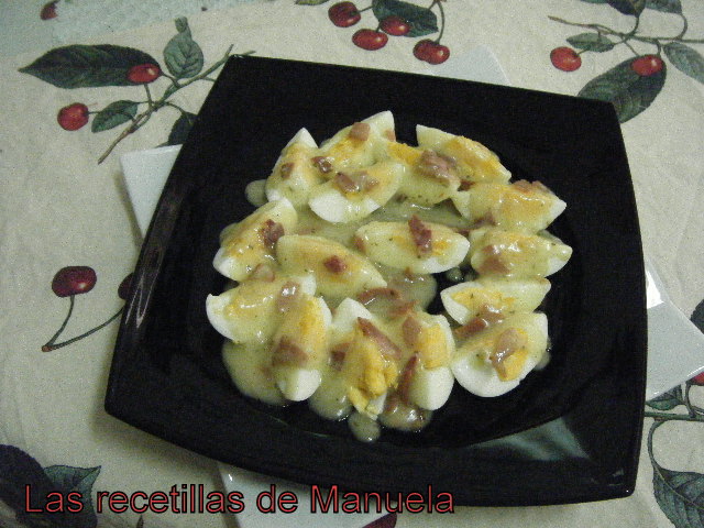 6 Coloque los huevos cortados en rodajas o en cuartos en una fuente, riegue con la salsa, decore con unas hojas de perejil y sirva.