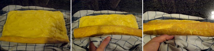 - Seguidamente después de un buen rato, cuando hayáis hecho la crema pastelera (libro imprescindible) y este fría, desenrollareis, el bizcocho, rellenáis con la crema y volveréis a enrollar con cuidado: