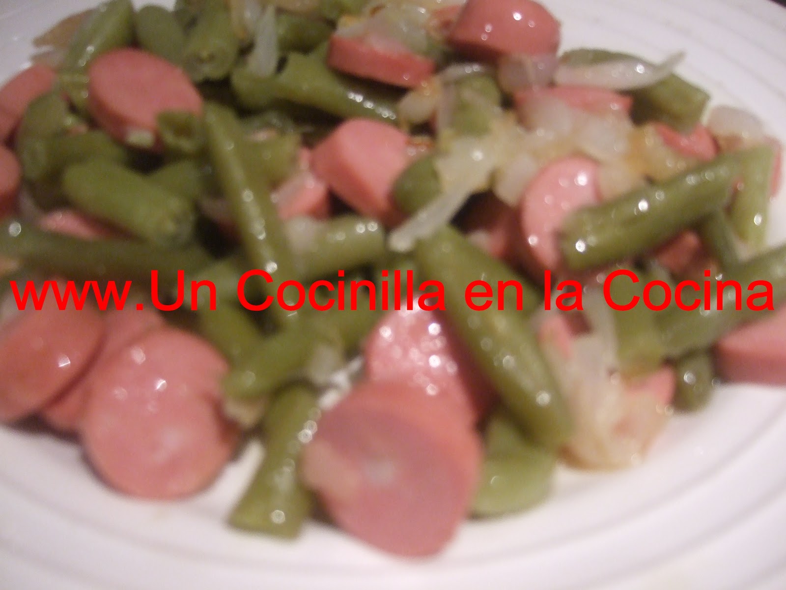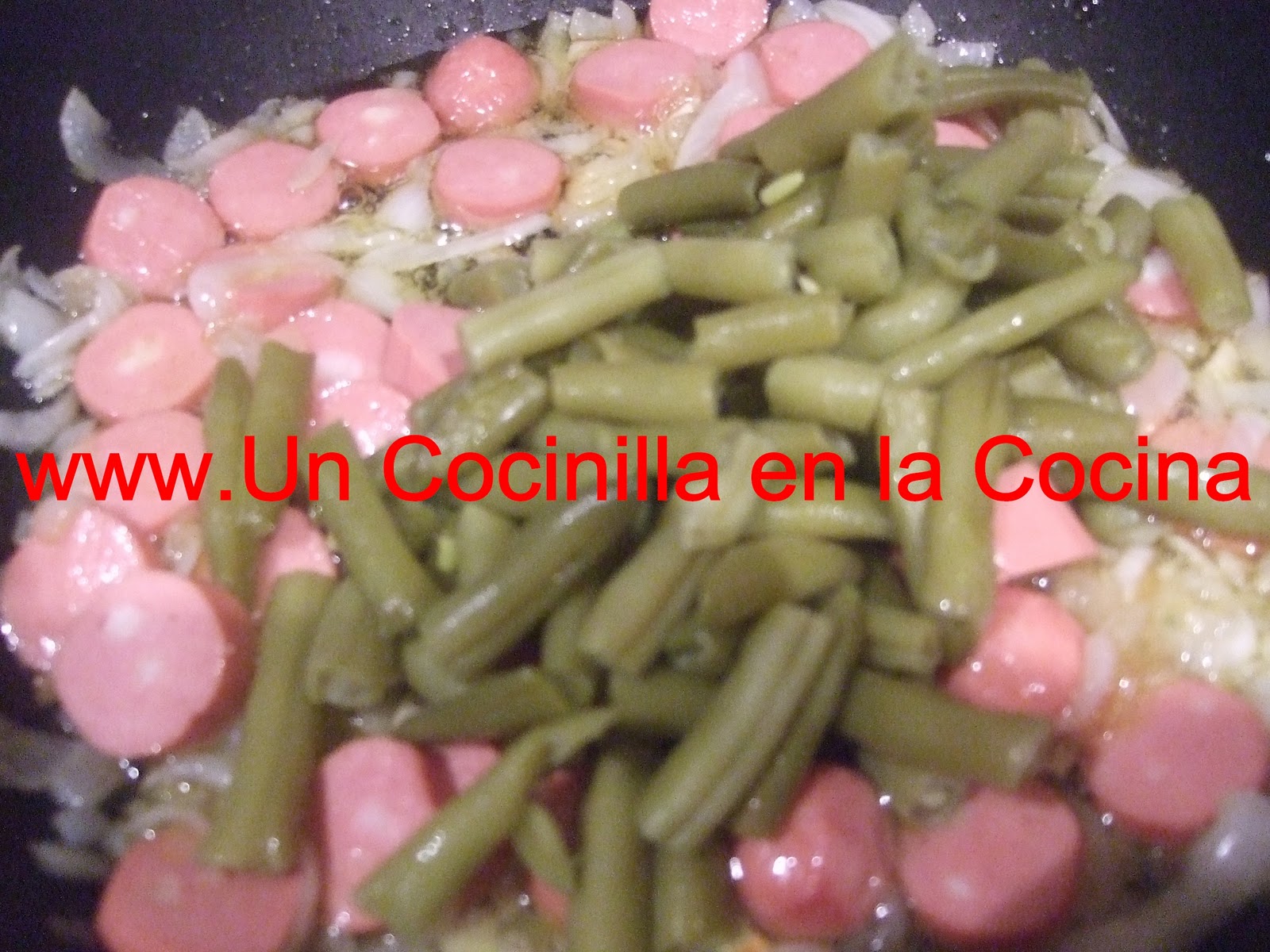 Cuando este pochada se le añade sal y se parten las salchichas en rodajas y se incorporar en la sartén.