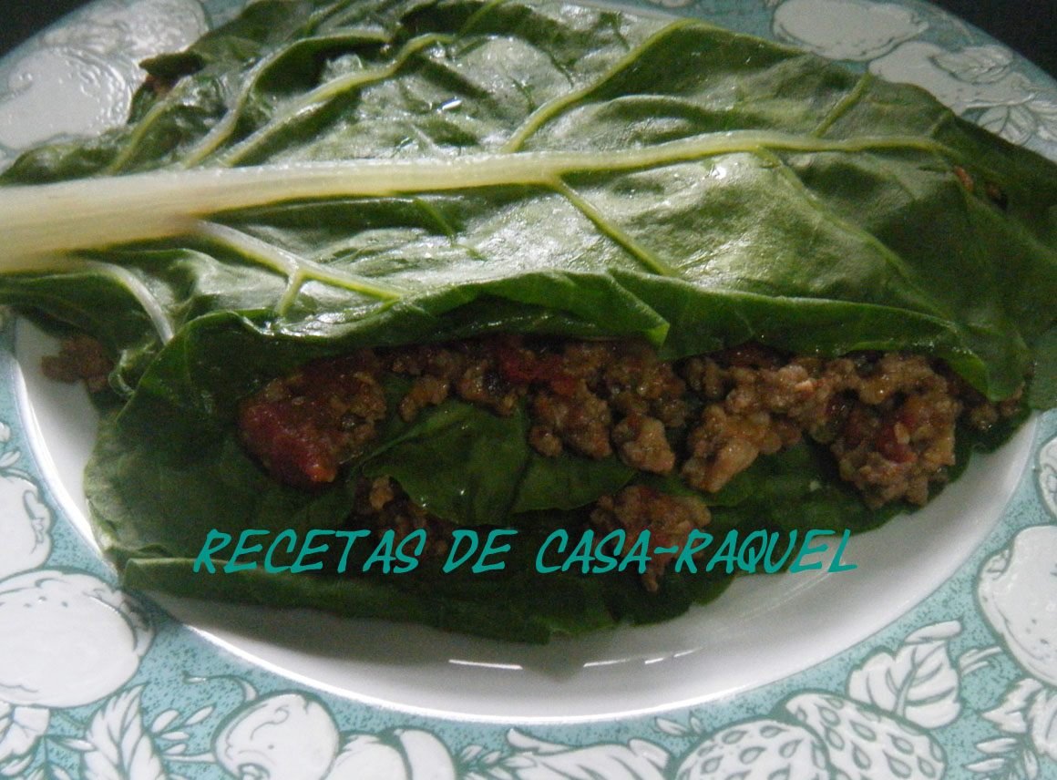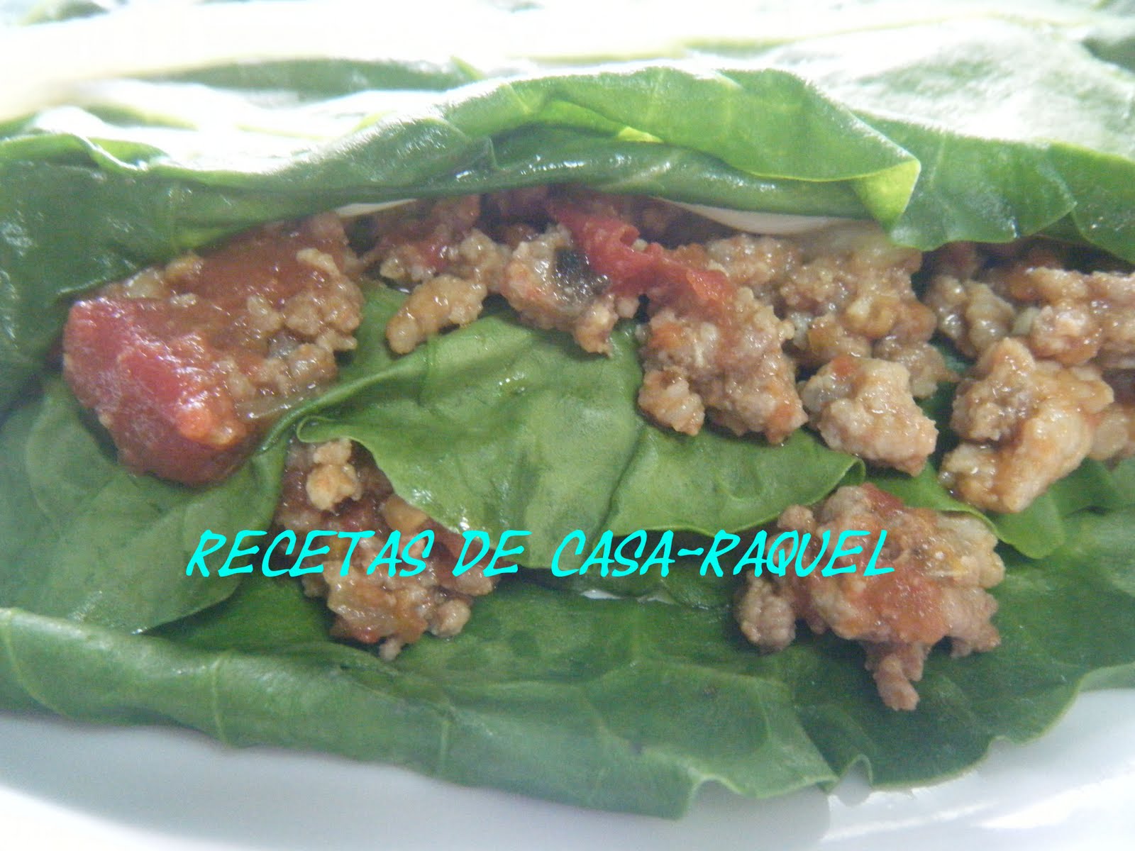 Para montar la lasaña pones; primero una hoja de acelga, rellenas con la carne, encima pones una loncha de queso y encima de este otra hoja de acelgas y así hasta que quieras terminando en acelga.