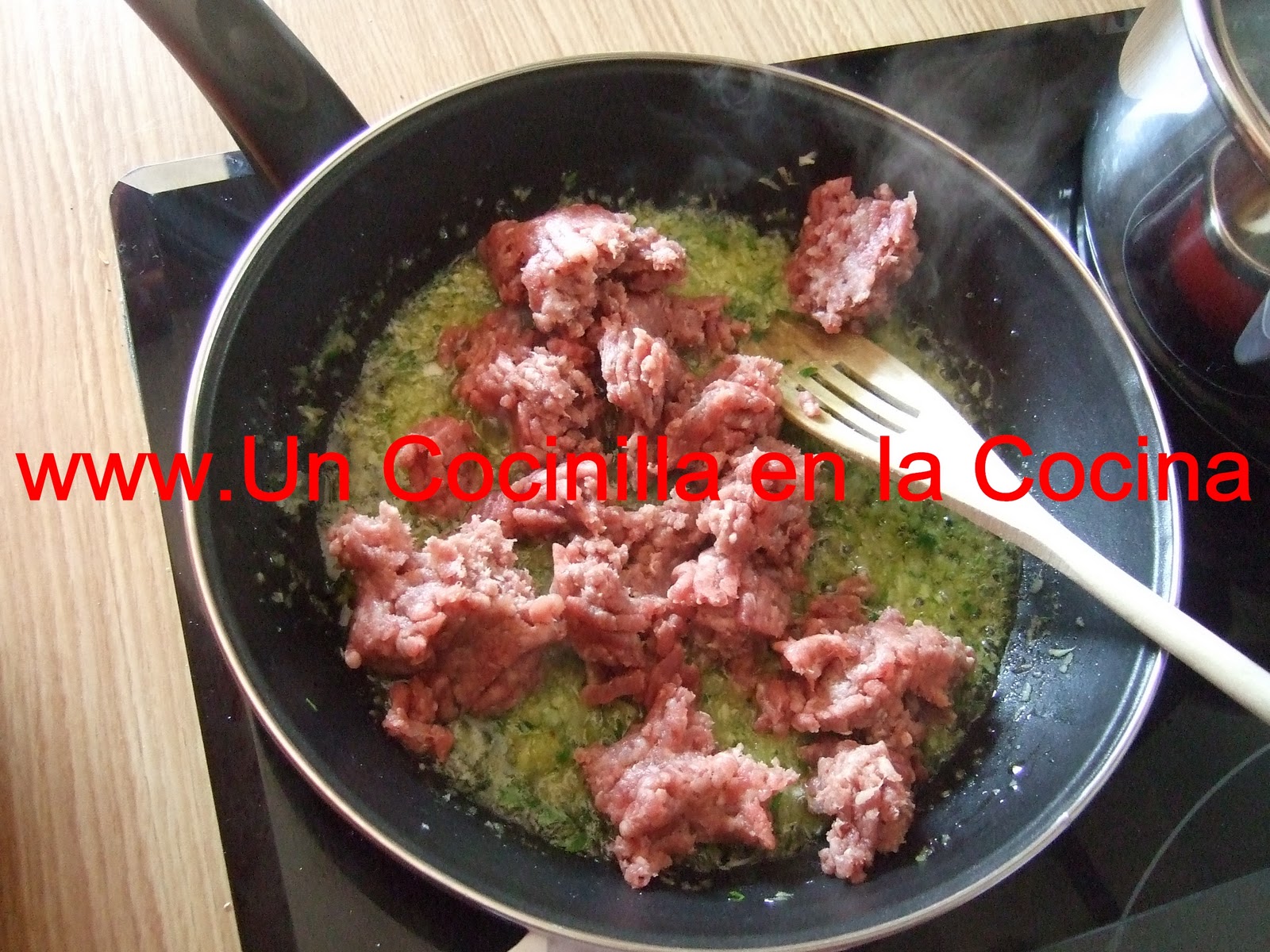 Ir desmenuzando la carne hasta que este frita y en trocitos muy finos.
