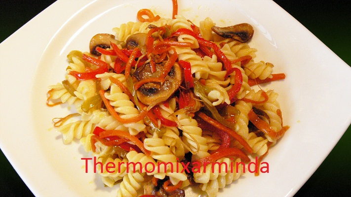 Nota: con el tiempo que marca la receta la verdura queda al dente. Si os gusta más hecha, sólo hay que programar un par de minutos más cuando añadimos los pimientos y los champiñones.