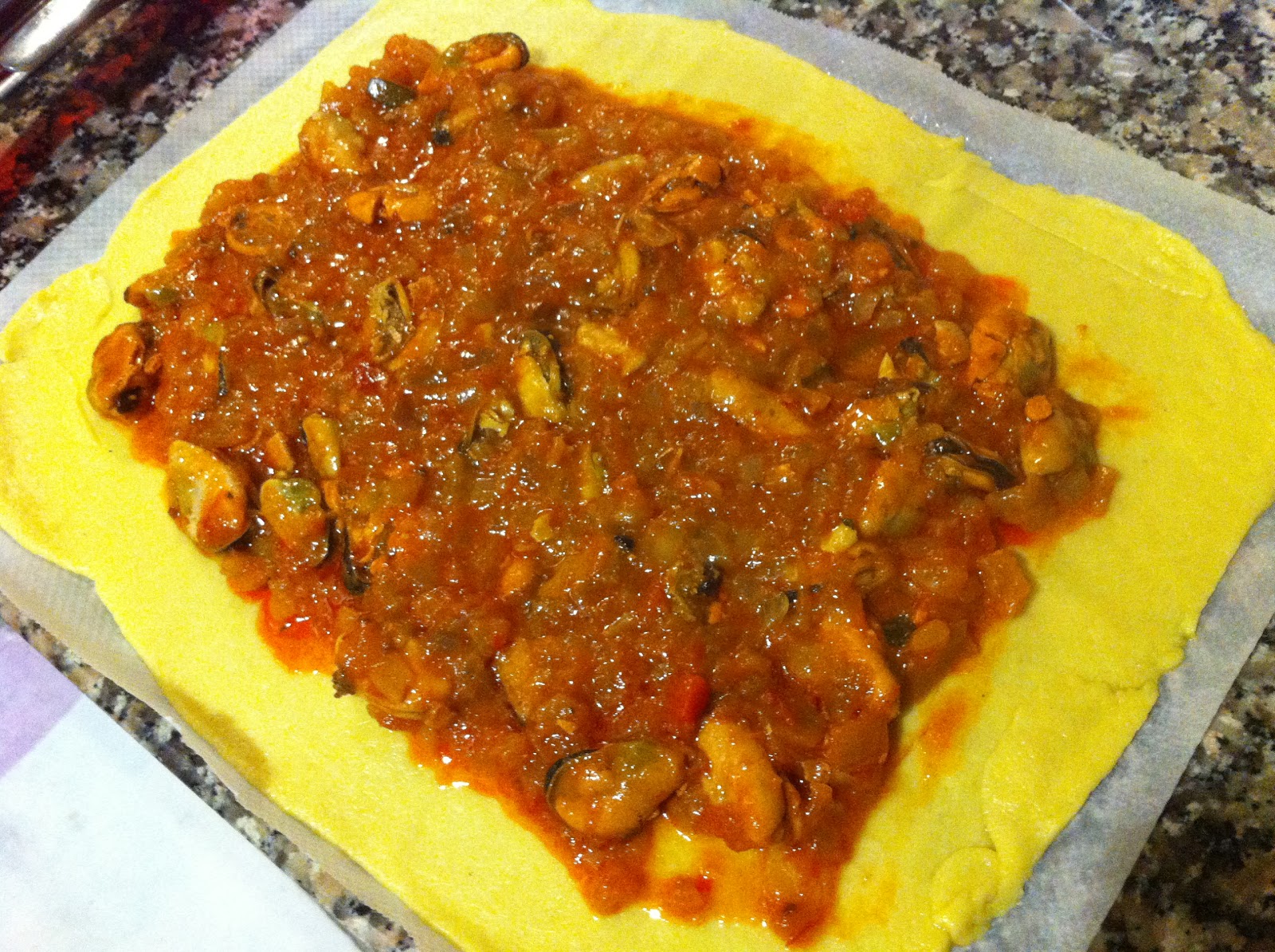 | Colocando el relleno (frío), en este caso de mejilones. |