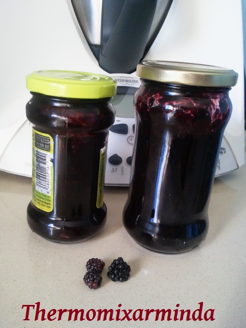Lavamos las moras, las ponemos en el vaso de la Thermomix, 15 segundos a velocidad 4, seguidamente agregamos el azúcar y el limón, programamos 30 minutos, 100º y velocidad 1.