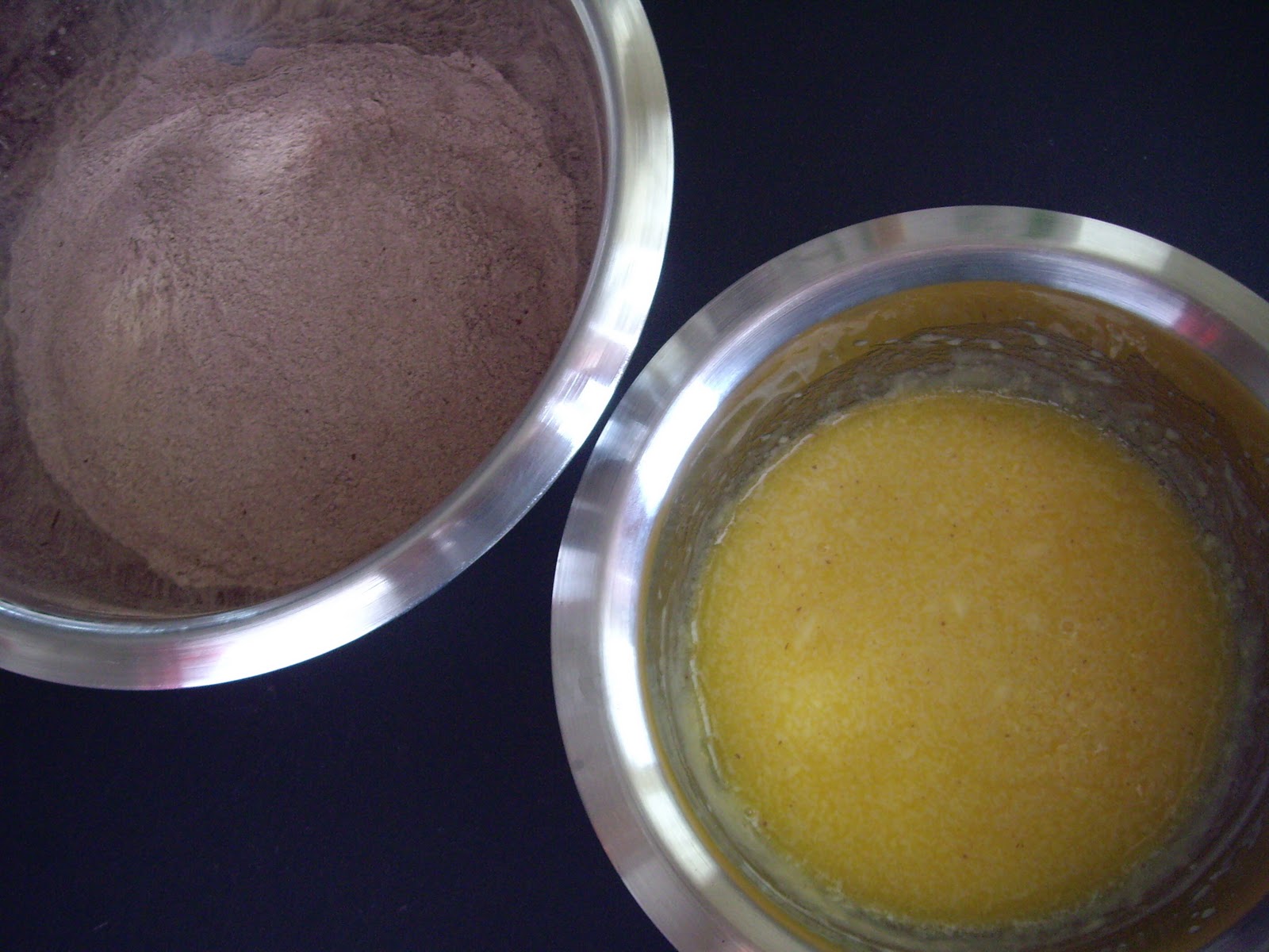 Mezclamos en un bol los ingredientes secos (harina, azúcar, levadura y cacao) y reservamos.