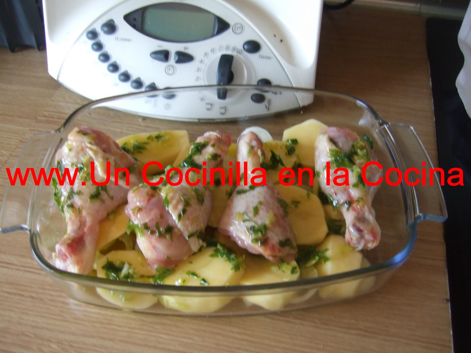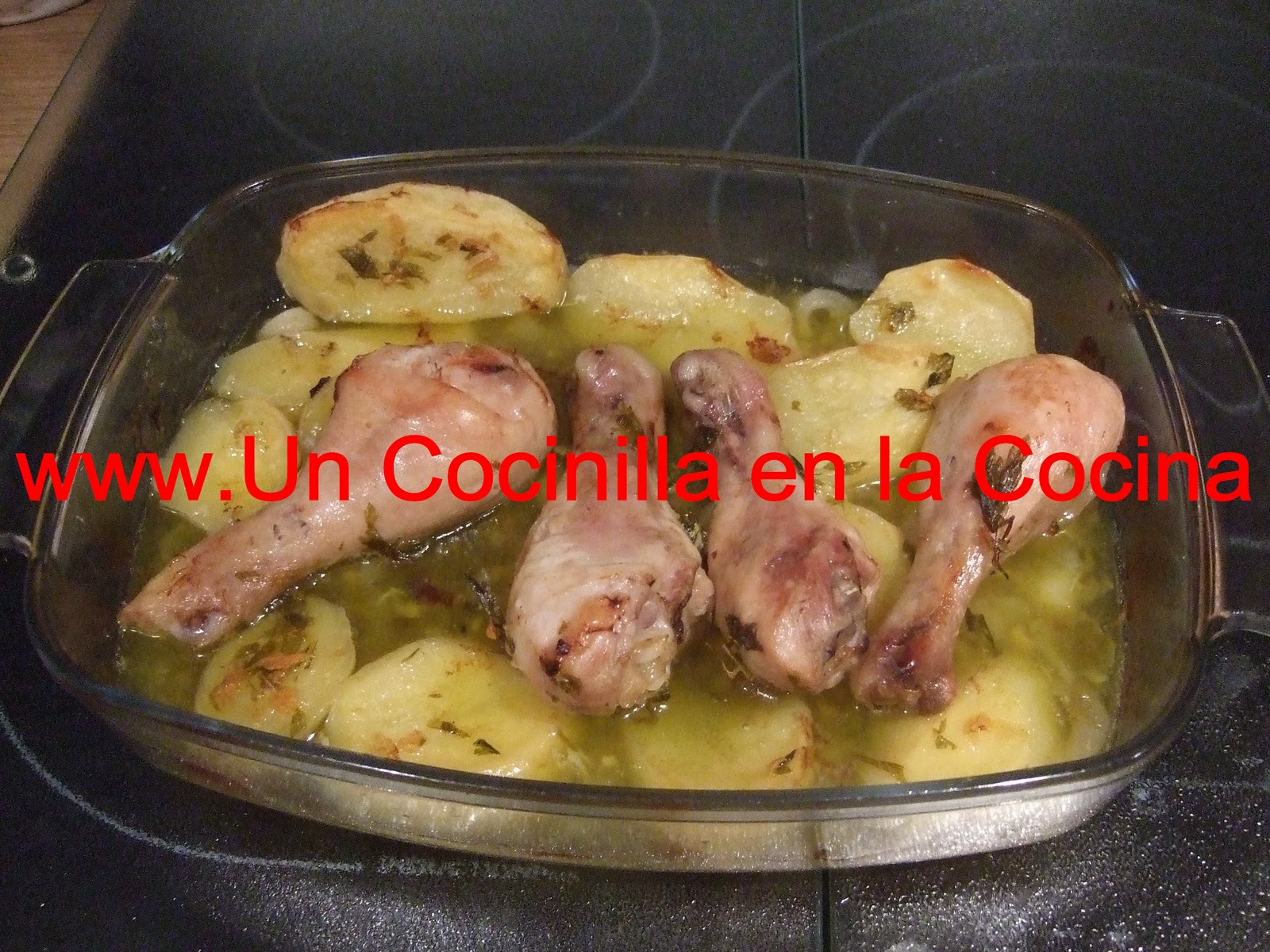 Se colocan los muslos de pollo encima de las patatas y las cebollas.