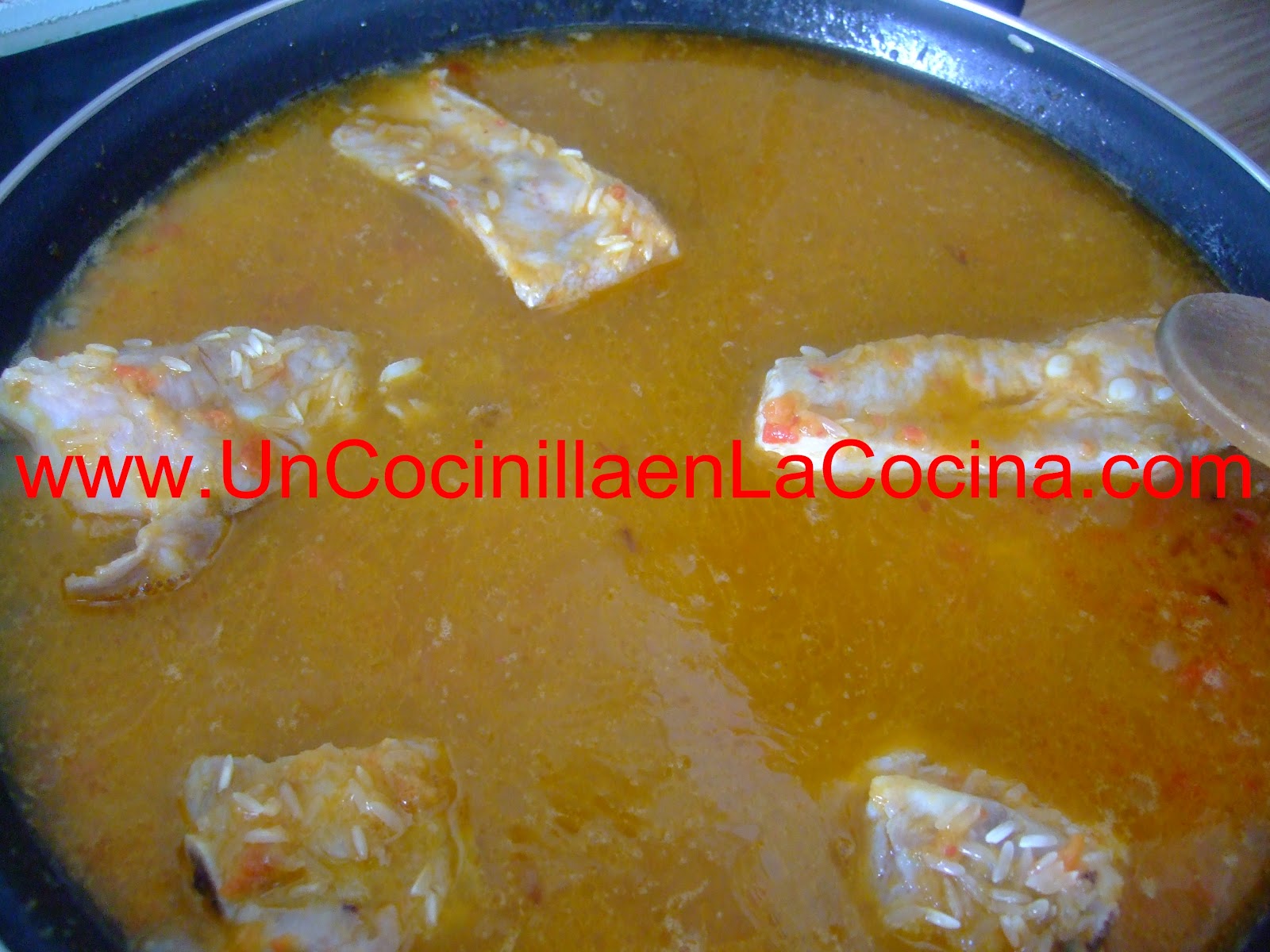 Se le incorpora el caldo de las gambas. Y se le añade el azafrán y el colorante