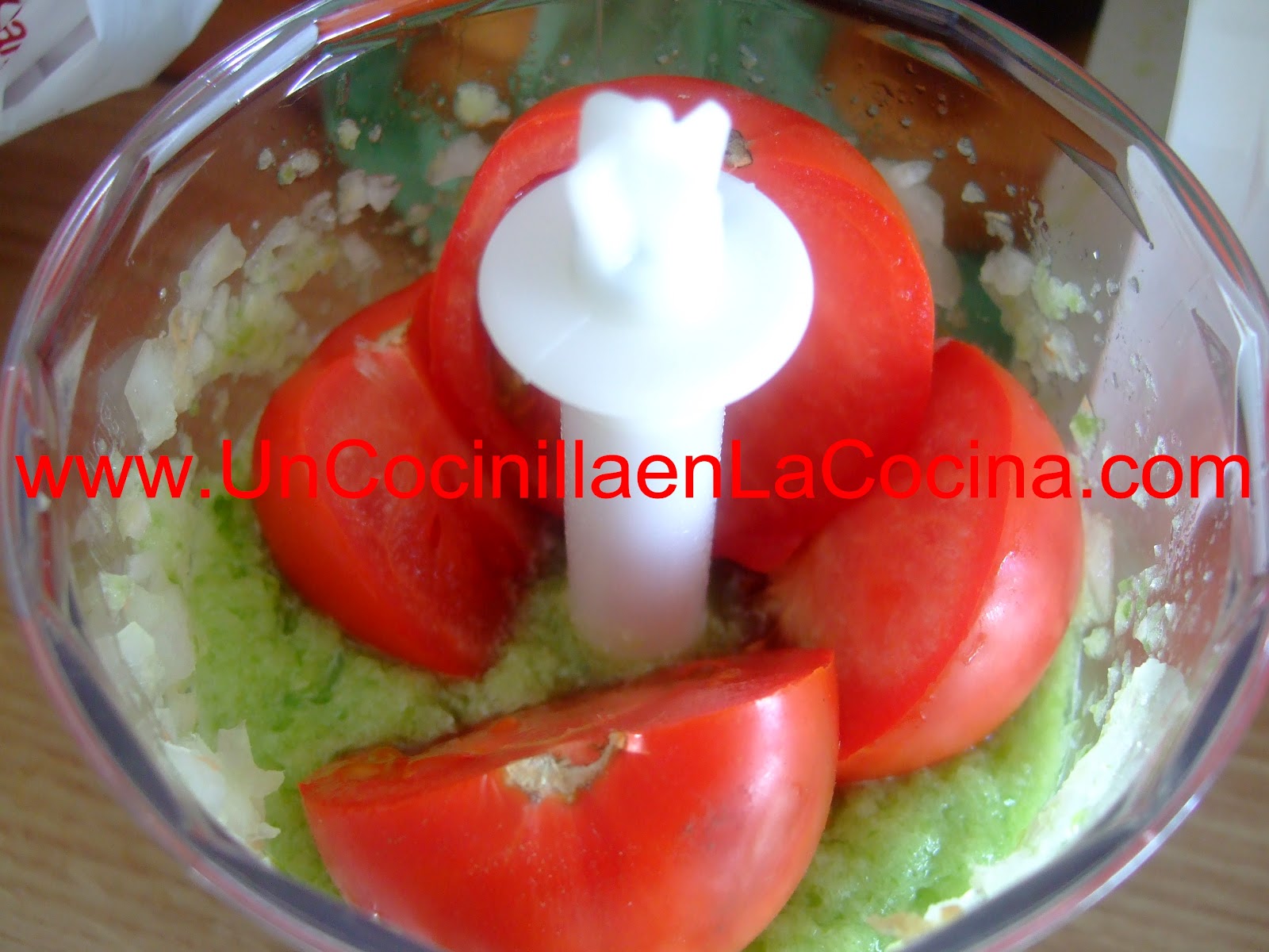 Se coje una cebolla, dos dientes de ajos, un pimiento verde y un par de tomates naturales se ponen en la picadora y se pican.