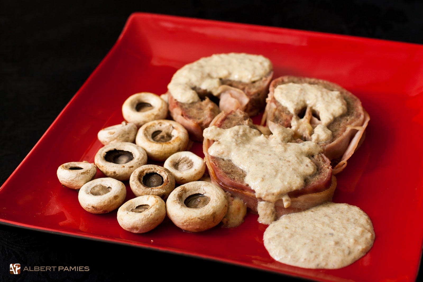 - Coloque las lonchas de jamón sobre la carne y las de queso sobre el jamón. Enrolle todo como si fuera un brazo de gitano y selle con los extremos apretando muy bien. Ponga el rollo de carne en el recipiente varoma y perfore el film varias veces con alguna aguja o cuchillo pequeño. Tape el recipiente varoma y reserve
