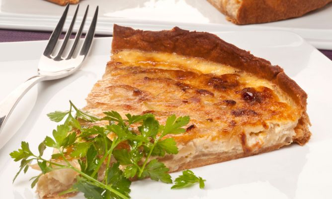 6.-Rellena la tarta precocida con el relleno de cebollas, nata y huevos. Hornea 30 minutos a 160º en el horno precalentado. Puedes comoer el pastel caliente o frío.