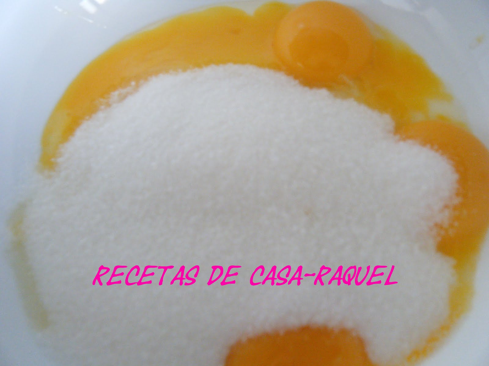 Las yemas las batimos con la mitad del azúcar hasta que quede una pasta blanquecina.