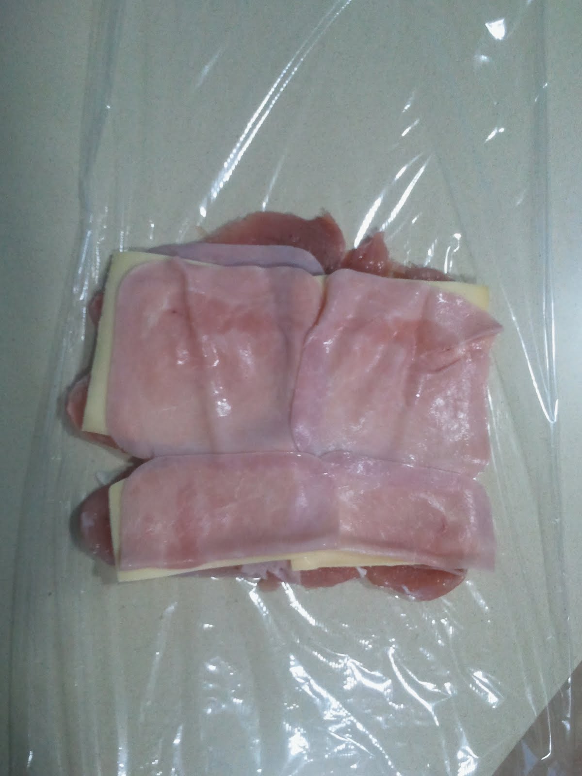 1.-Colocar las pechugas abiertas en forma de libro, salpimentar y colocar encima unas lonchas de jamón y de queso, cerrar en forma de rollo y con film de cocina o con papel de aluminio, formar unos rollos apretando bien los extremos que quede bien prieto.